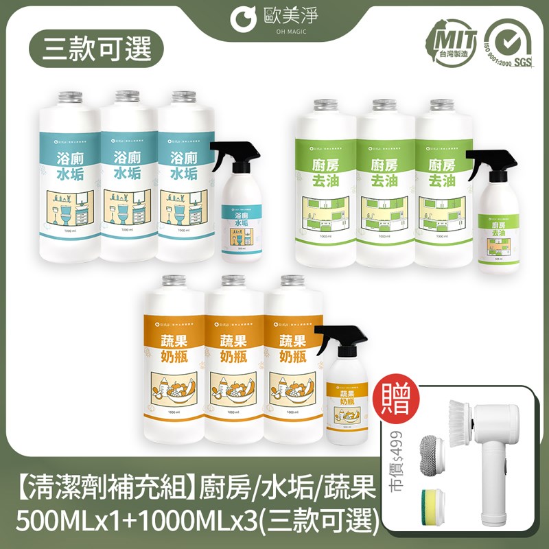 【歐美淨】【清潔劑補充組】500MLx1+1000MLx3(廚房/水垢/蔬果三款可選)贈電動清潔刷