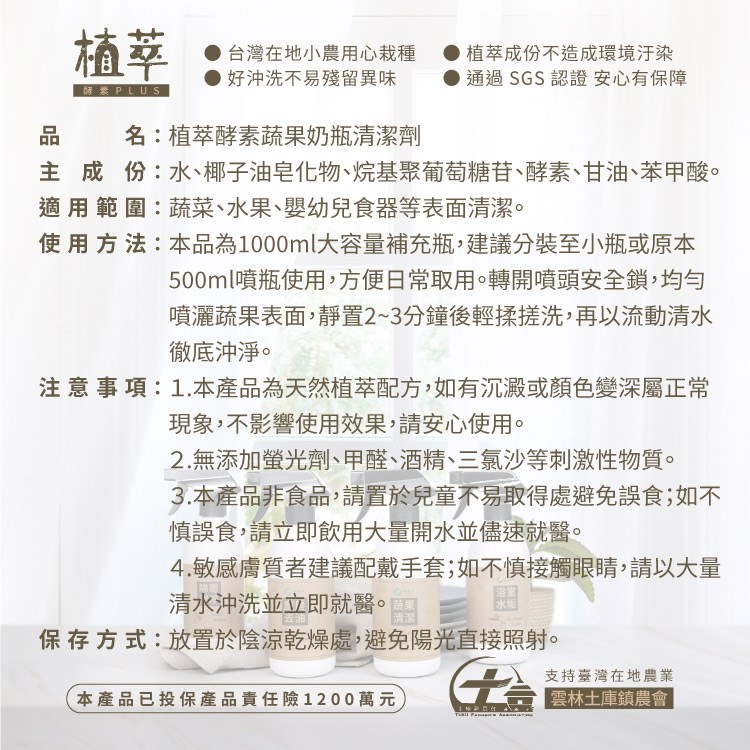 蔬果奶瓶清潔劑-水、椰子油皂化物、烷基聚葡萄糖苷、酵素、甘油、苯甲酸。