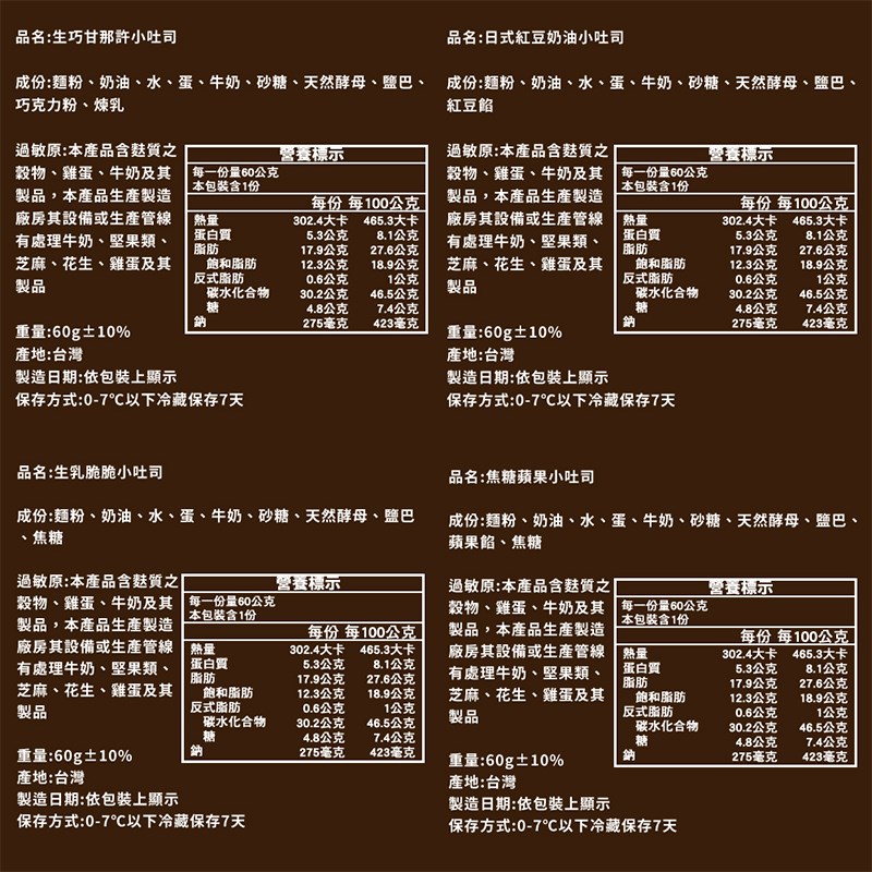 過敏原:本產品含麩質之穀物、雞蛋、牛奶及其製品,本產品生產製造廠房其設備或生產管線有處理牛奶、堅果類、芝麻、花生、雞蛋及其製品