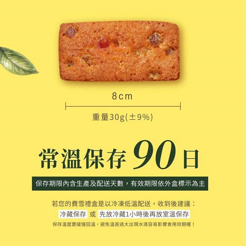 成分:奶油、新鮮蛋液、蔗糖、低筋麵粉、三寶柑果醬(三寶柑、蔗糖、蜂蜜、檸檬酸、鹽、維生素C)、桔皮丁、龍眼蜂蜜、無鋁泡打粉 (磷酸二氫鈣、碳酸氫鈉、玉米粉)