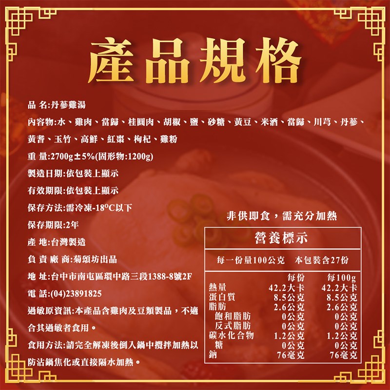 內容物:水、雞肉、當歸、桂圓肉、胡椒、鹽、砂糖、黃豆、米酒、當歸、川芎、丹蔘、 黃耆、玉竹、高鮮、紅棗、枸杞、雞粉