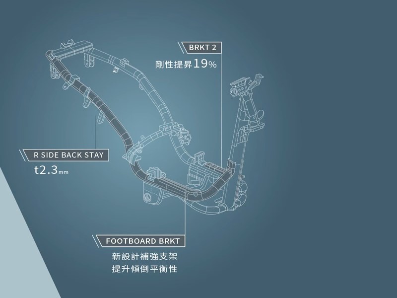 為CYGNUS所打造新一代高剛性車架。剛性提升15~19%,平穩耐操。搭配新設計補強支架,提升傾倒平衡性,超車、過彎駕控更精準靈敏。