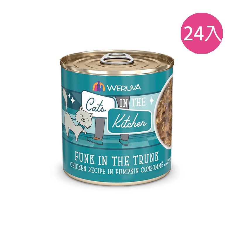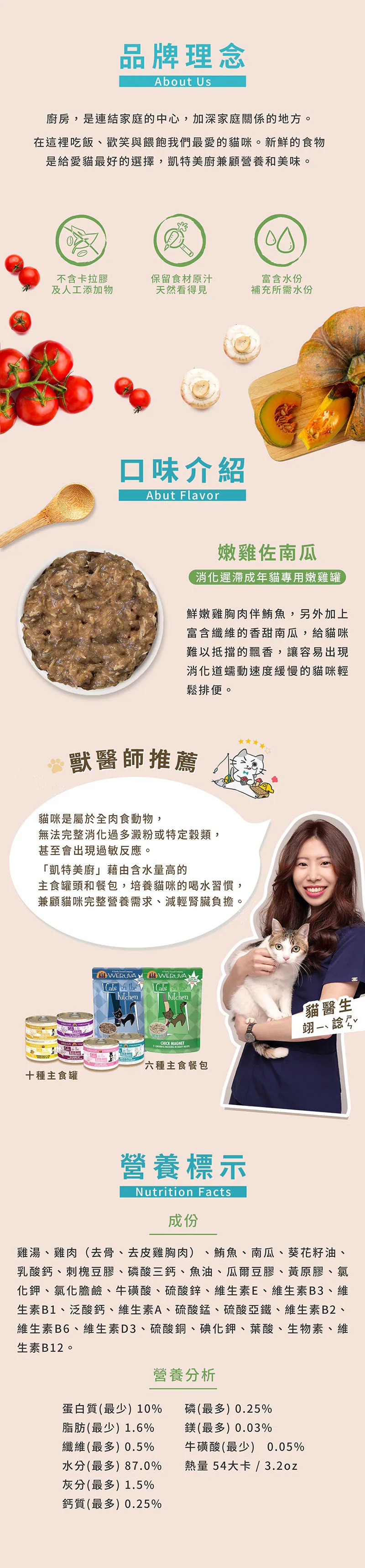 雞湯、雞肉(去骨、去皮雞胸肉)、鮪魚、南瓜、葵花籽油、乳酸鈣、刺槐豆膠、磷酸三鈣、魚油、瓜爾豆膠、黃原膠、氯化鉀、氯化膽鹼、牛磺酸、硫酸鋅、維生素E補充劑、維生素B3、維生素B1、錳蛋白、泛酸鈣、維生素A補充劑、硫酸亞鐵、維生素B2、維生素B6、葉酸、硫酸銅、維生素D3補充劑、碘化鉀、生物素、維生素B12補充劑。