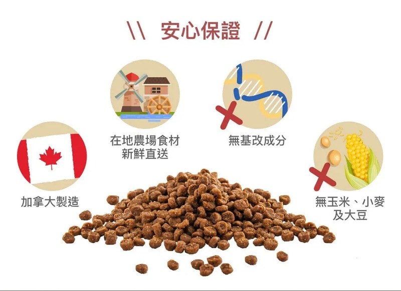 雞肉茸、燕麥、豌豆、雞脂(以天然維他命E保質)、糙米、魚肉茸、天然香料、亞麻籽、磷酸、氯化鉀。蔬果:蔓越莓、南瓜、蘋果、藍莓、胡蘿蔔、菠菜、番茄、地瓜、花椰菜、香蕉。氯化鈉。礦物質:硫酸鋅、硫酸亞鐵、硫酸銅、氧化錳、碘酸鈣、亞硒酸鈉。維生素:維生素A、維生素D3、維生素E、菸酸、泛酸鈣、硫胺、吡哆醇、核黃素、維生素K、葉酸、生物素、維生素B12。菊苣根、迷迭香萃取物、DL-蛋氨酸、氯化膽鹼、牛磺酸、絲蘭萃取物。