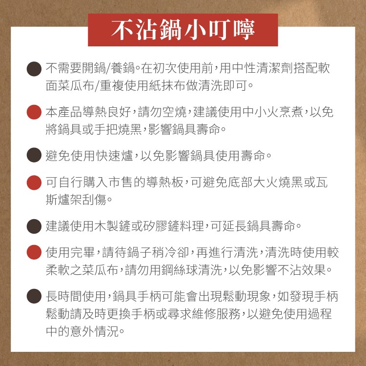 1.鍋內不沾塗層,請使用木餐具或矽膠杓等,不要用鋼絲球清洗。