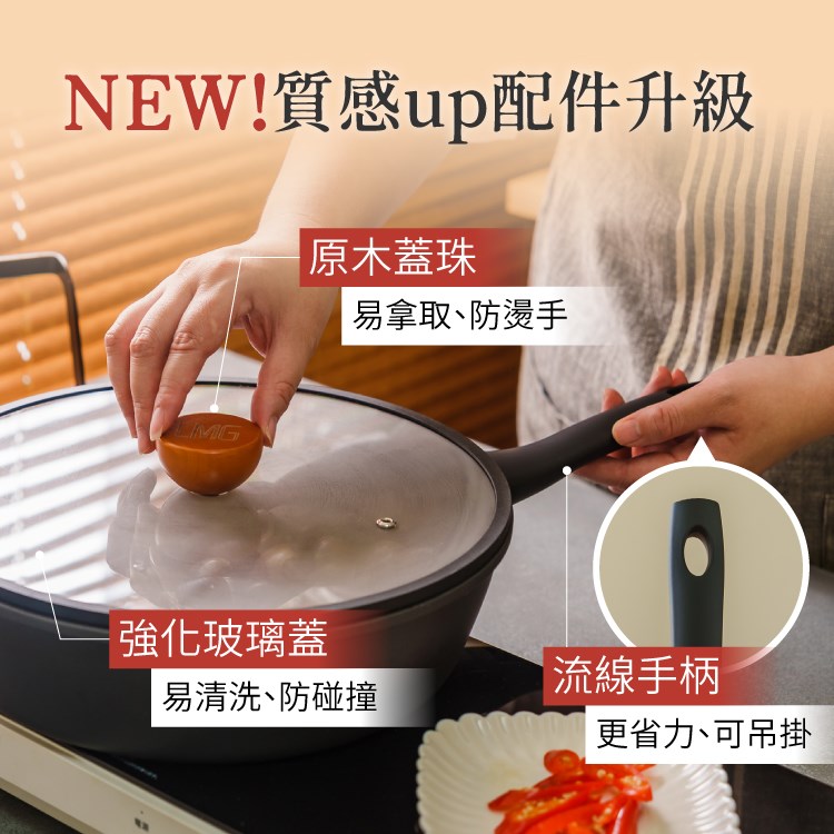 •強化玻璃鍋蓋+原木蓋珠頭,易拿取、防燙手。
