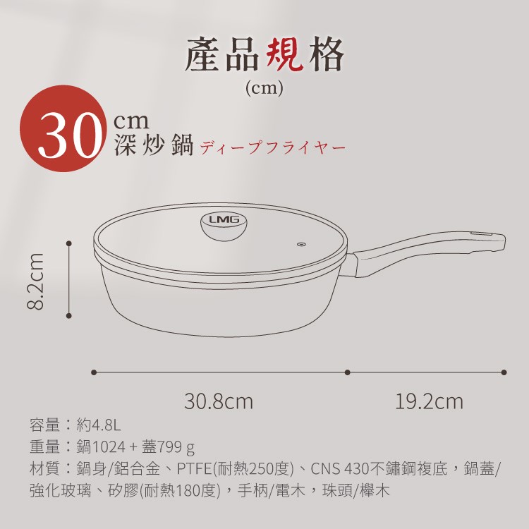 材質:鍋身-鋁合金、PTFE(耐熱250度)/覆底-CNS430不鏽鋼/手柄-防燙電木手把/鍋蓋-強化玻璃、矽膠(耐熱180度)/鍋蓋珠頭-櫸木