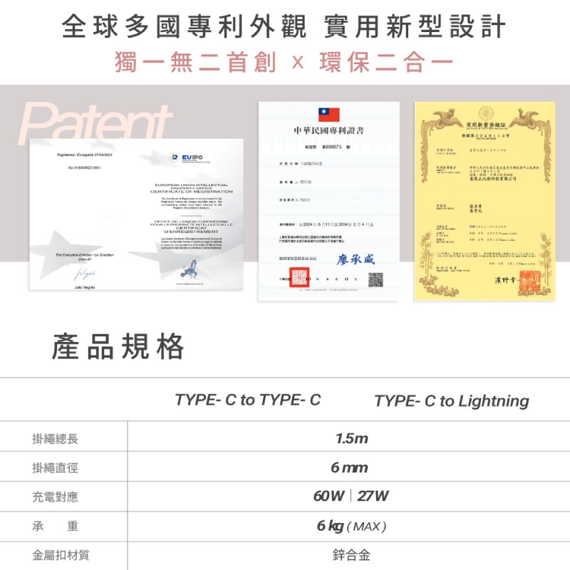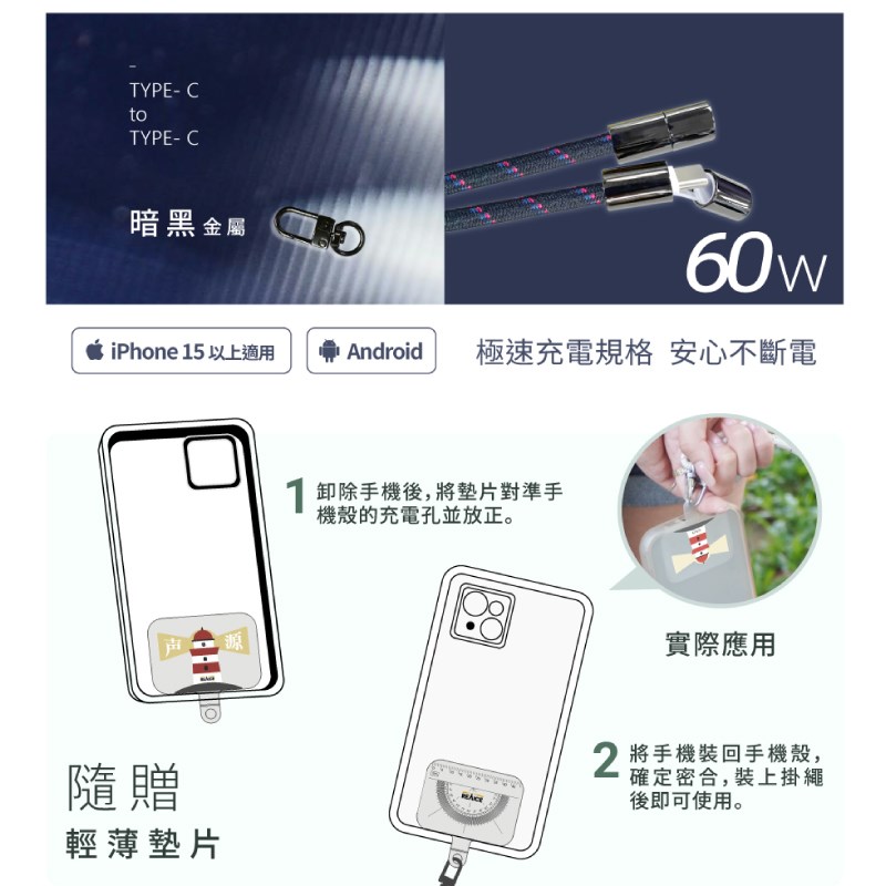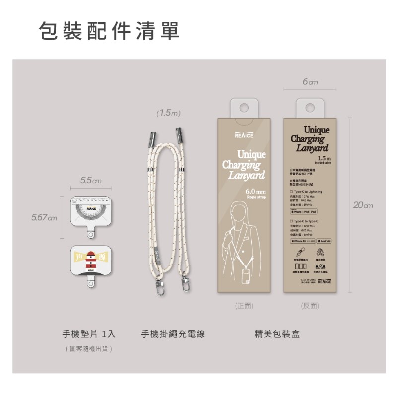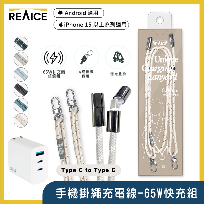【REAICE】2WAY手機掛繩充電線Type-C to Type-C-65W快充組 贈墊片乙入