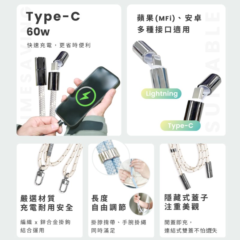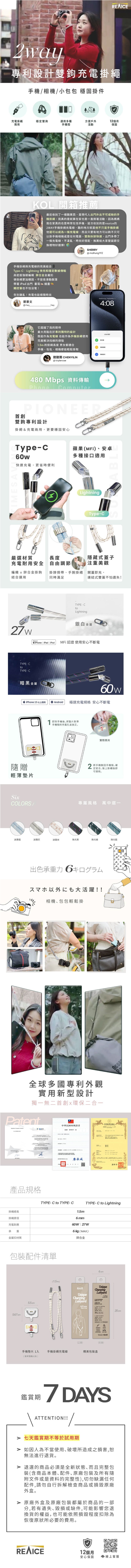 【REAICE】2WAY手機掛繩充電線Type-C to Type-C