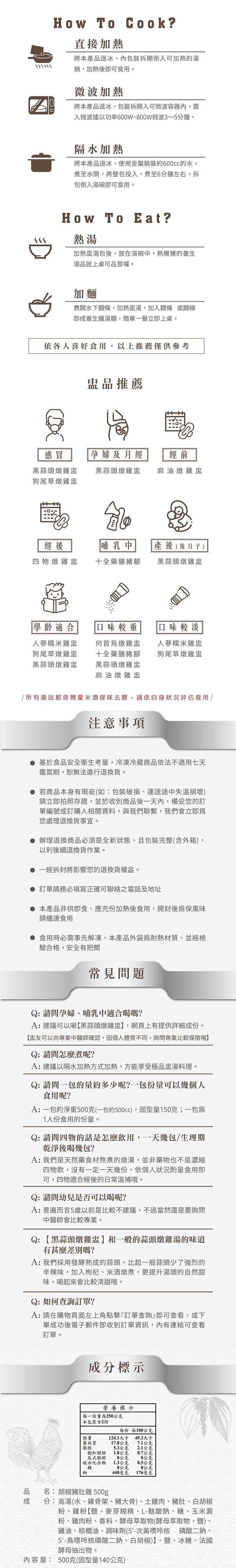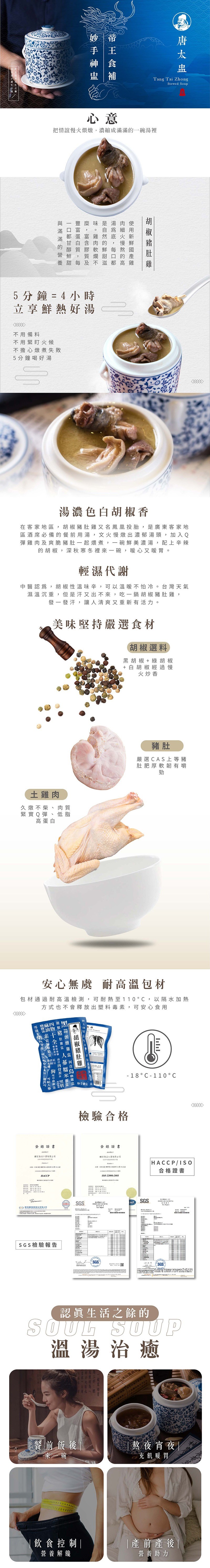 成分:高湯(水、雞骨架、豬大骨)、土雞腿、豬肚、白胡椒粉、雞粉【鹽、麥芽糊精、L-麩酸鈉、糖、玉米澱粉、雞肉粉、香料、酵母萃取物(酵母萃取物、鹽)、雞油、棕櫚油、調味劑(5'-次黃嘌呤核、磷酸二納、5'-鳥嘌呤核苷磷酸二鈉、白胡椒)】、鹽、冰糖、白胡椒、法國酵素抽取物。