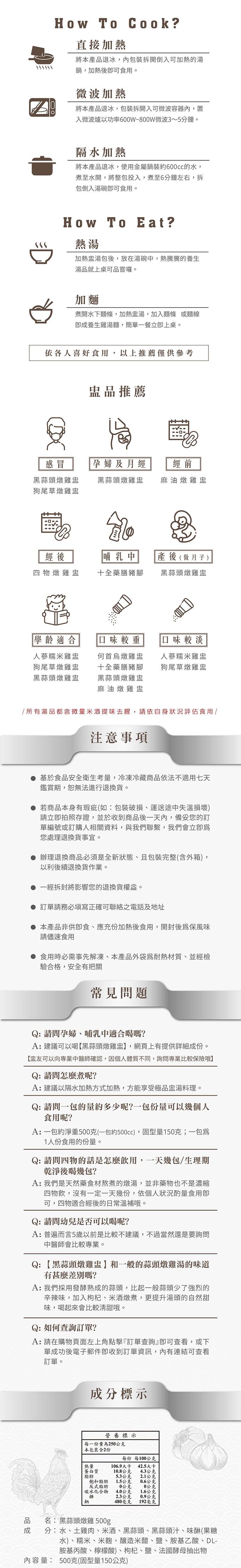 成分:水、土雞腿、米酒、黑蒜頭、黑蒜頭汁、味醂(果糖水、糯米、米麴、釀造米醋、鹽、胺基乙酸、DL-胺基丙酸、檸檬酸)、枸杞、鹽、法國酵母抽出物