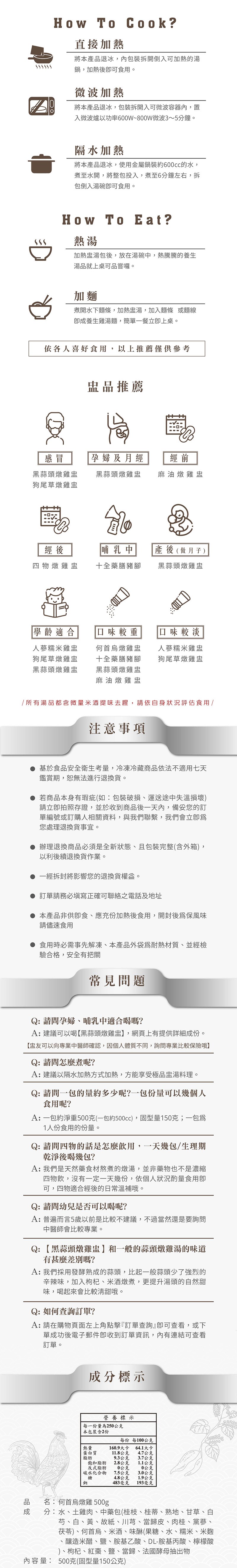 成分:水、土雞肉、中藥包(桂枝、桂蒂、熟地、甘草、白芍、白朮、黃芪、故紙、川芎、當歸皮、肉桂、黨蔘、茯苓)、何首烏、米酒、味醂(果糖、水、糯米、米麴、釀造米醋、鹽、胺基乙酸、DL-胺基丙酸、檸檬酸)、枸杞、紅棗、鹽、當歸、法國酵母抽出物
