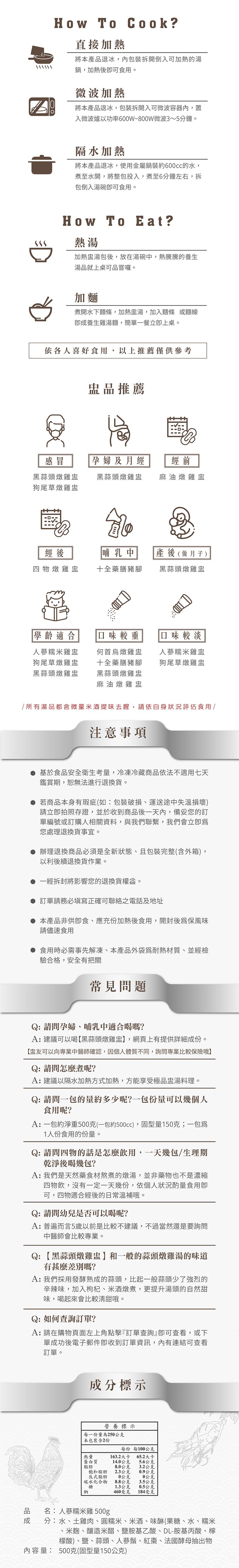 成分:水、土雞腿、圓糯米、米酒、味醂(果糖水、糯米、米麴、釀造米醋、鹽、胺基乙酸、DL-胺基丙酸、檸檬酸)、鹽、蒜頭、人蔘鬚、紅棗、法國酵母抽出物