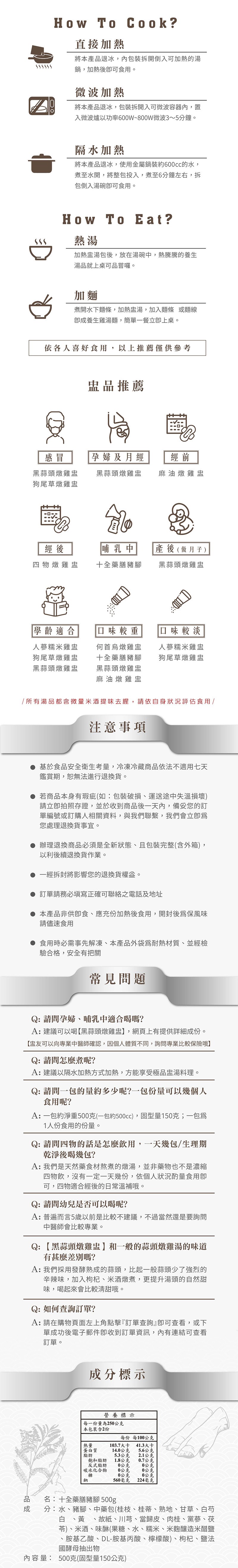 成分:水、豬腳、中藥包(桂枝、桂蒂、熟地、甘草、白芍、白朮、黃芪、故紙、川芎、當歸皮、肉桂、黨蔘、茯苓)、米酒、味醂(果糖、水、糯米、米麴、釀造米醋、鹽、胺基乙酸、DL-胺基丙酸、檸檬酸)、枸杞、鹽、法國酵母抽出物