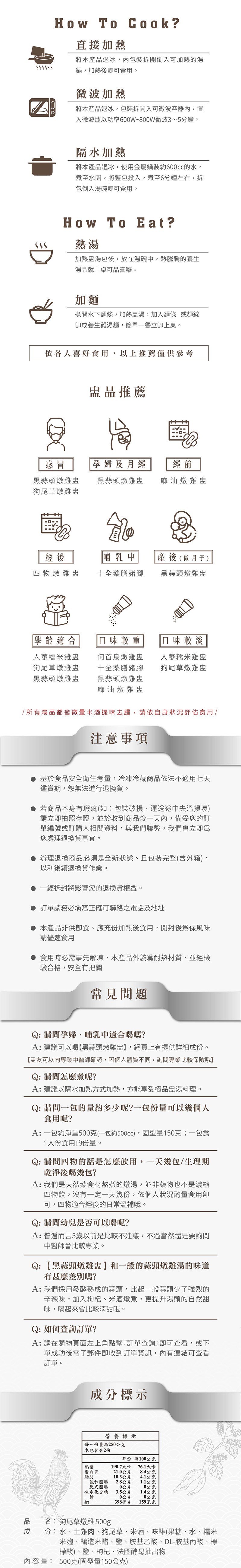 成分:水、土雞肉、狗尾草、米酒、味醂(果糖、水、糯米、米麴、釀造米醋、鹽、胺基乙酸、DL-胺基丙酸、檸檬酸)、鹽、枸杞、法國酵母抽出物