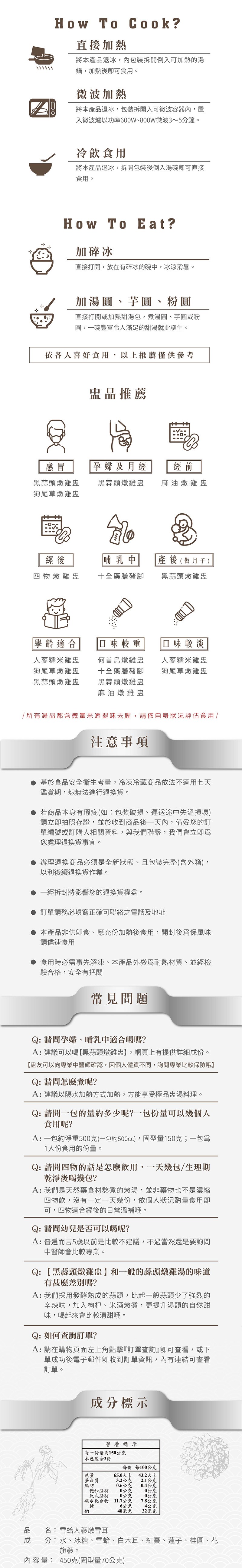 成分:水、冰糖、雪蛤、白木耳、紅棗、蓮子、桂圓、花旗蔘