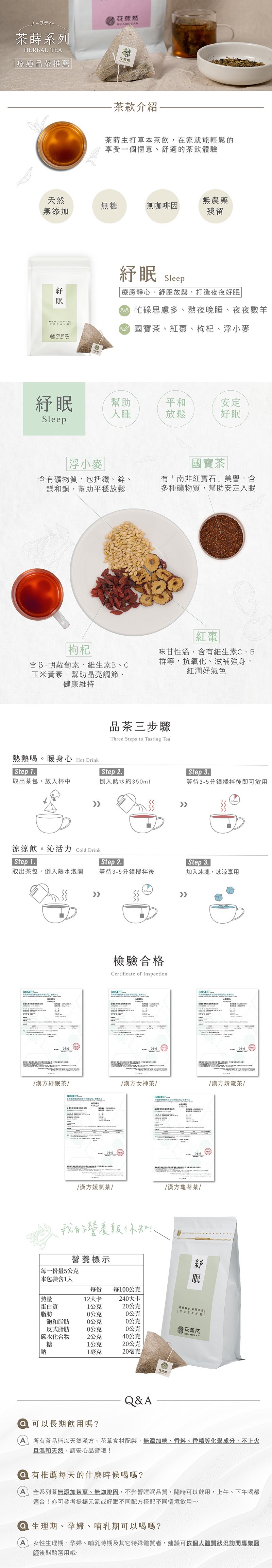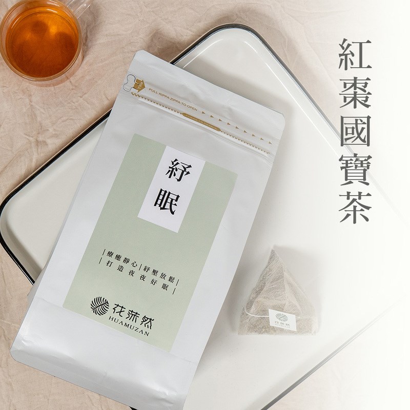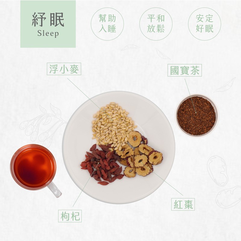 溫潤無咖啡因配方,紓眠選用南非國寶茶搭配紅棗、枸杞、浮小麥等漢方草本,香氣安定、口感柔順。