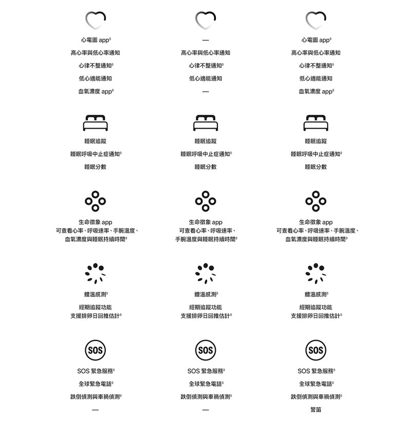 ◎ 心率偵測、睡眠監測、ECG 心電圖測量、血氧濃度感測、高血壓偵測、經期追蹤