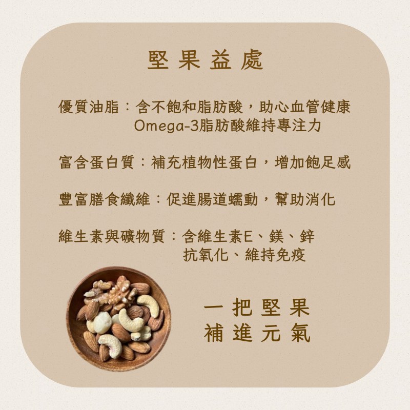 🥜 優質堅果:富含優質脂肪與蛋白質,滿足日常營養所需。