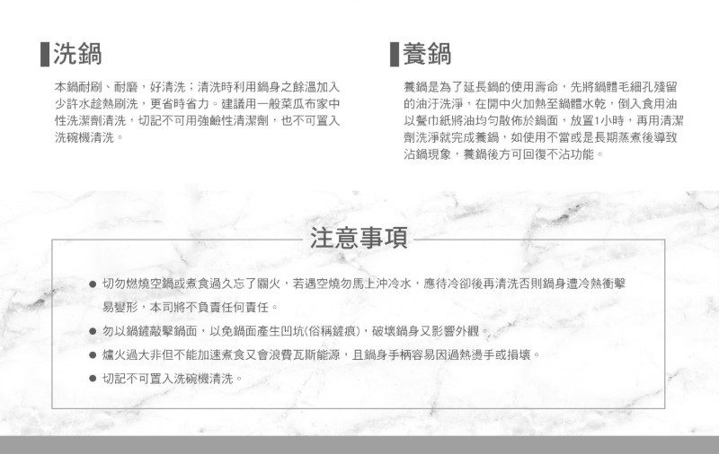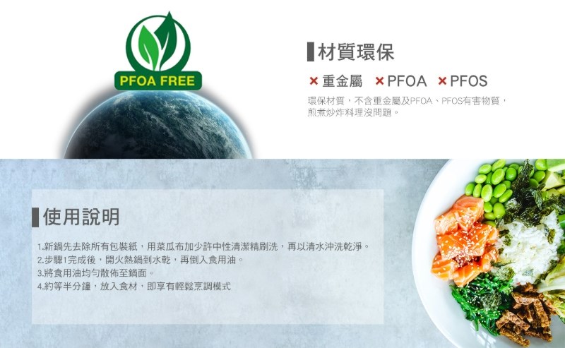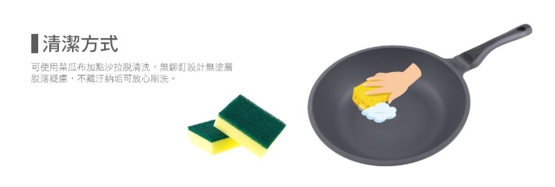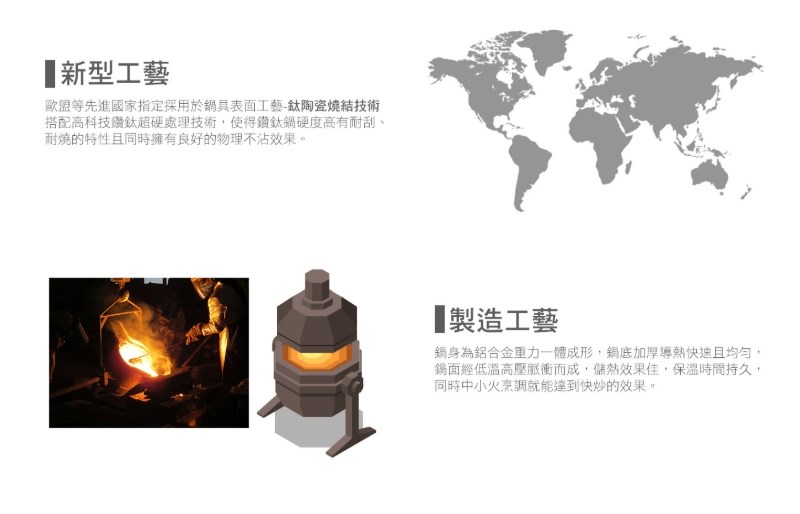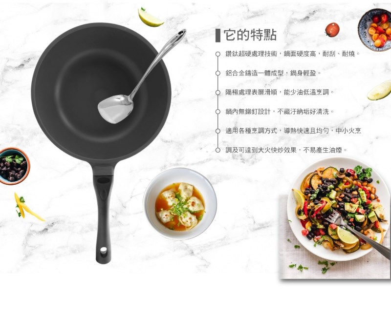 理不沾效果。鍋身為鋁鈦合金重力一體成型,鍋底加厚導熱快速且均勻,鍋面經低溫高壓脈衝而成,儲熱效果佳、保溫時間持久,同時中小火烹調就能達到大火快
