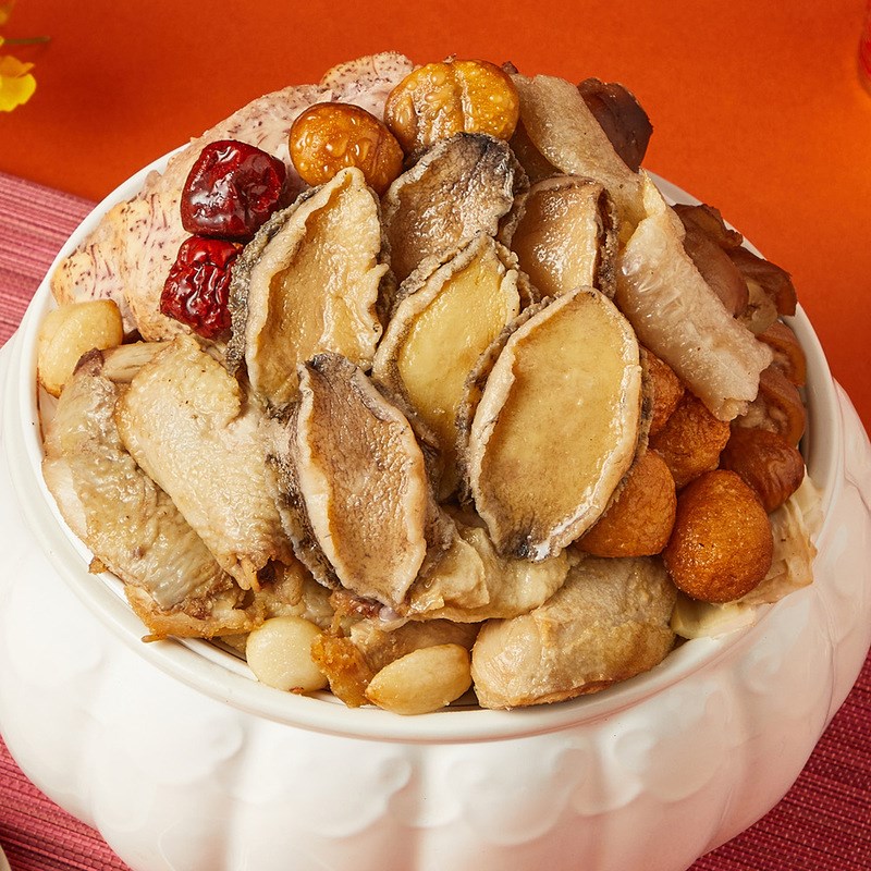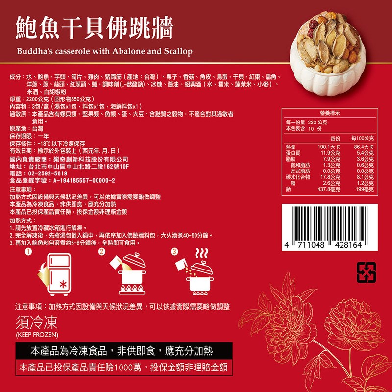 主要成分:水、鮑魚、芋頭、筍片、雞肉、豬蹄筋(產地:台灣)、栗子、香菇、魚皮、鳥蛋、干貝、紅棗、扁魚、洋蔥、蔥、蒜頭、紅蔥頭、鹽、調味劑(L-麩酸鈉)、冰糖、醬油、紹興酒(水、糯米、蓬萊米、小麥)、米酒、白胡椒粉。
