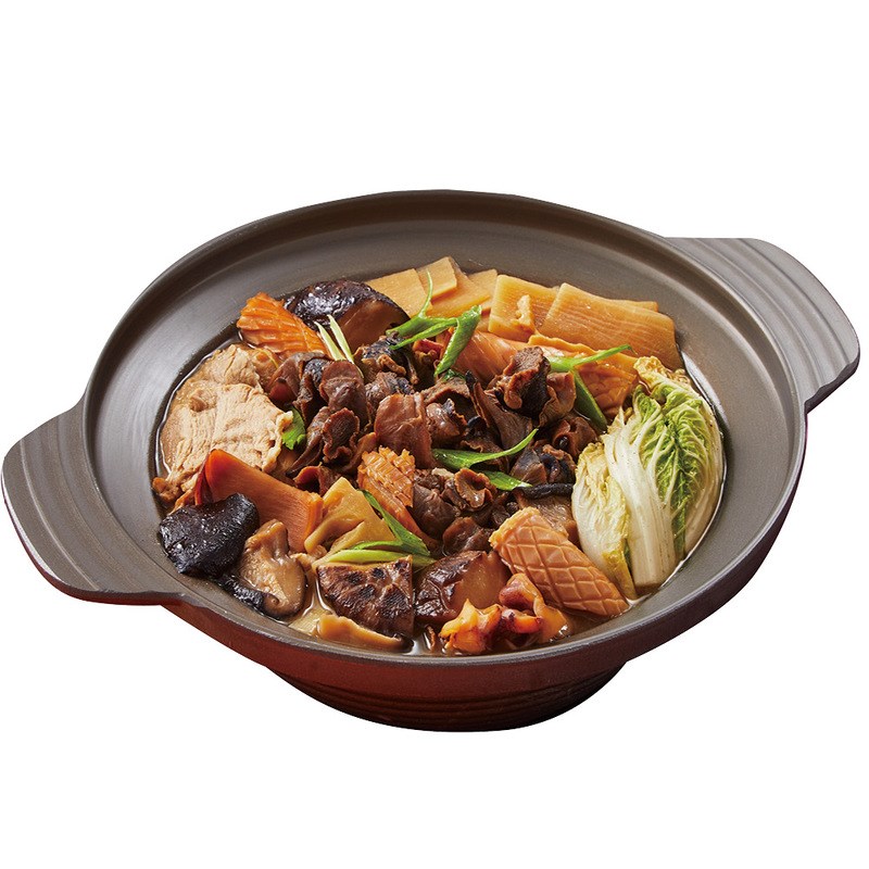 主要成分:高湯(水、豬骨(產地:台灣)、蠔油【水、蠔汁、糖、鹽、調味劑(L-麩酸鈉)、粘稠劑(羥丙基磷酸二澱粉)、小麥、著色劑(焦糖色素)】、紹興酒(水、糯米、蓬萊米、小麥)、白胡椒粉)、魷魚、調味螺肉[水、螺肉、糖、醬油、鹽、玉米糖膠、味醂(糯米、蓬萊米、果糖、水、釀造米酢、鹽)、多磷酸鈉、甘草靈(糖、檸檬酸鈉、甘草酸一銨(甜味劑))]、豬肉(產地:台灣)、娃娃菜、花菇、筍片、蒜苗、芹菜。