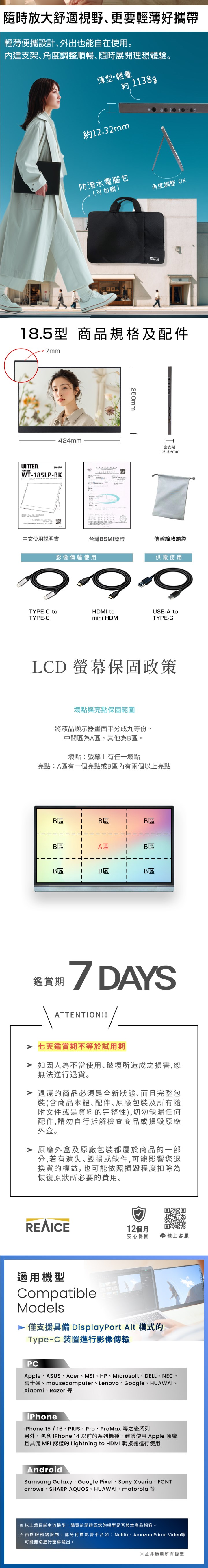 配件:使用說明書/保固卡、Type-A對Type-C 傳輸線、Type-C對 Type-C 傳輸線、HDMI對minini HDMI 傳輸線、傳輸線收納袋