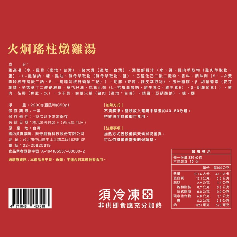 主要成分:雞高湯(水、雞骨(產地:台灣)、豬大骨(產地:台灣)、濃縮鮮雞汁(水、鹽、雞肉萃取物(雞肉萃取物、鹽)、L-麩酸鈉、糖、雞油、酵母萃取物(酵母萃取物、鹽)、乙醢化己二酸二澱粉、香料、調味劑(5'-次黃嘌呤核苷磷酸二鈉、5'-鳥嘌呤核苷磷酸二鈉))、明膠(來源:豬皮萃取物)、玉米糖膠、β-胡蘿蔔素(麥芽糊精、辛烯基丁二酸鈉澱粉、葵花籽油、抗氧化劑(L-抗壞血酸鈉、維生素C、維生素E)、β-胡蘿萄素))、雞肉、花膠(魚肚、水)、小干貝、金華火腿(豬肉(產地:台灣)、精鹽、亞硝酸鈉(0.07g/kg以下))、糖、鹽。