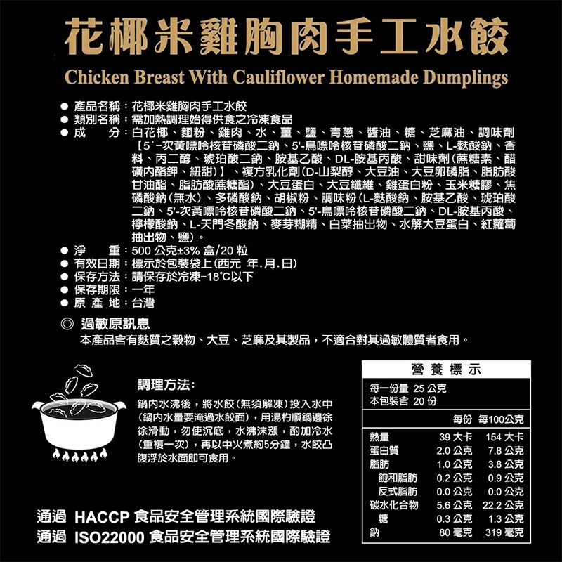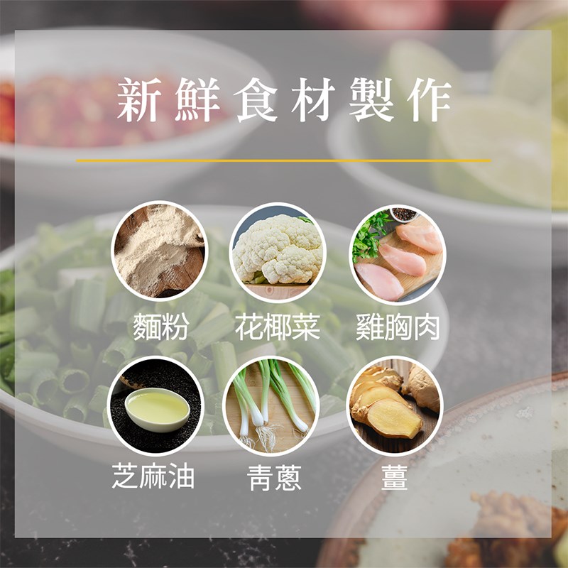 成分:白花椰、麵粉、雞肉、水、薑、鹽、青蔥、醬油、糖、芝麻油、調味劑【5'-次黃嘌呤核苷磷酸二鈉、5'-鳥嘌呤核苷磷酸二鈉、鹽、L-麩酸鈉、香料、丙二醇、琥珀酸二鈉、胺基乙酸、DL-胺基丙酸、甜味劑(蔗糖素、醋磺內酯鉀、紐甜)】、複方乳化劑(D-山梨醇、大豆油、大豆卵磷脂、脂肪酸甘油酯、脂肪酸蔗糖酯)、大豆蛋白、大豆纖維、雞蛋白粉、玉米糖膠、焦磷酸鈉(無水)、多磷酸鈉、胡椒粉、調味粉(L-麩酸訥、胺基乙酸、琥珀酸二鈉、5'-次黃嘌呤核苷磷酸二鈉、5-鳥嘌呤核苷磷酸二鈉、DL-胺基丙酸、檸檬酸鈉、L-天門冬酸鈉、麥芽糊精、白菜抽出物、水解大豆蛋白、紅蘿蔔抽出物、鹽)。