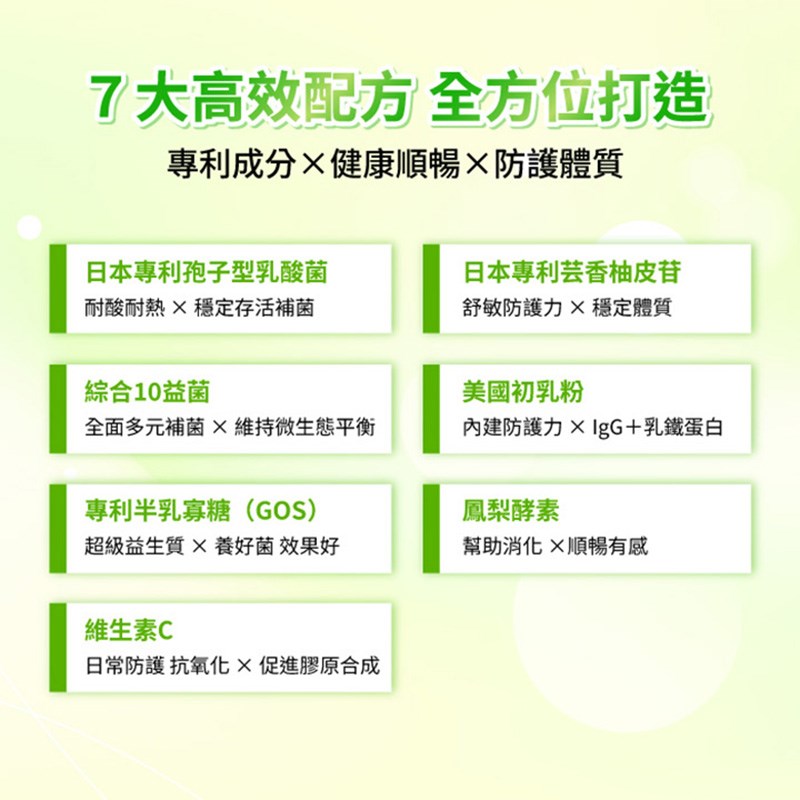 內容物:專利半乳寡醣(半乳寡醣、乳糖、葡萄糖、半乳糖)、鳳梨酵素(鳳梨酵素、麥芽糊精)、專利柑橘皮粉末(柑橘抽出物)、專利初乳粉(牛初乳、牛奶蛋白、奶粉、中鏈三酸甘油酯、卵磷脂(葵花)、香料)、專利孢子型乳酸菌(乳糖、乳酸菌)、綜合乳酸菌(10益菌)(難消化性麥芽糊精、麥芽糊精、嗜酸乳桿菌、乾酪乳桿菌、植物乳桿菌、副乾酪乳桿菌、鼠李糖乳桿菌、嬰兒雙歧桿菌、兩歧雙歧桿菌、長雙歧桿菌、乳雙叉桿菌、發酵乳桿菌、微結晶狀α-纖