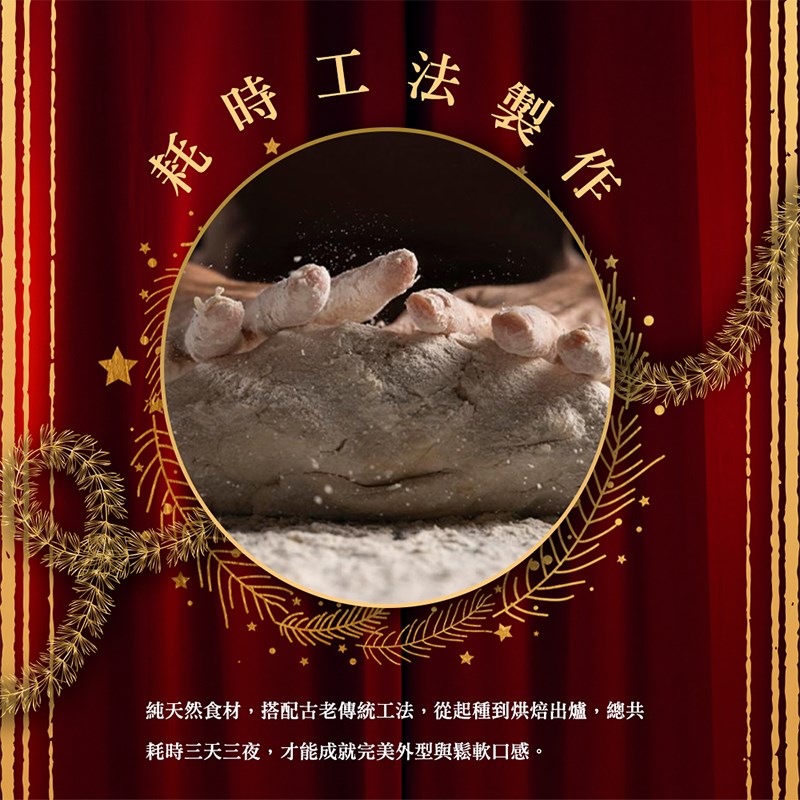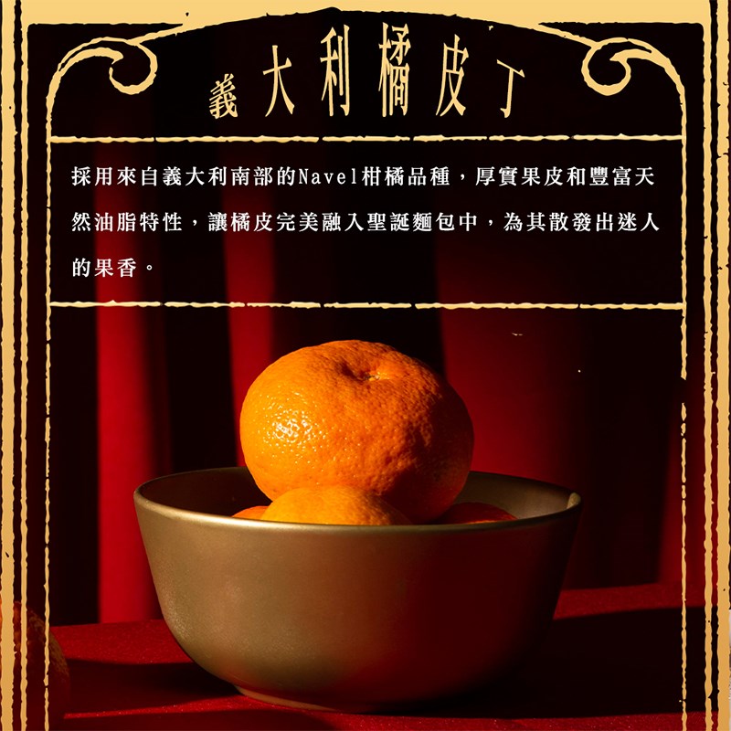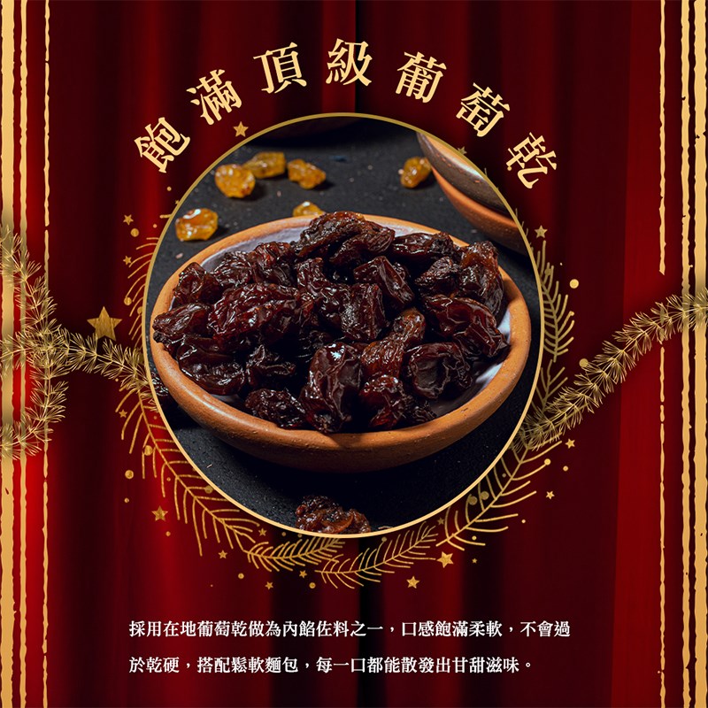 美好的時刻就該值得美好的禮品,外皮烤得酥脆金黃,帶來令人垂涎的口感,選用頂級橘皮與葡萄乾,不僅增添了視覺上的吸引力,也散發出水果香氣,今年聖誕最能表達心意的美食贈禮!