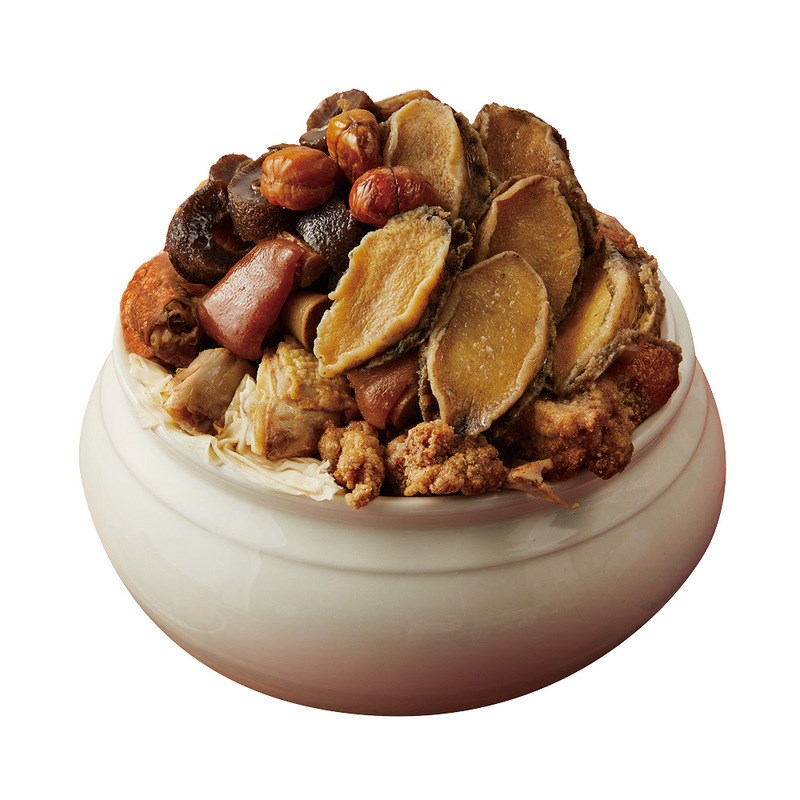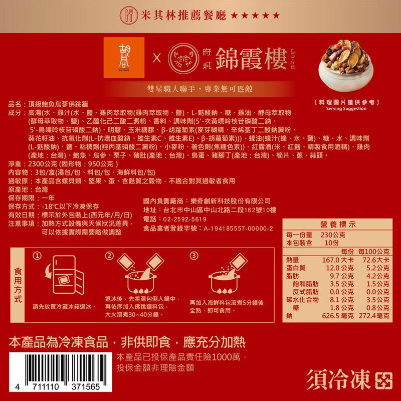 主要成分:高湯(水、雞汁(水、鹽、雞肉萃取物 (雞肉萃取物、鹽) 、L-麩酸鈉、糖、雞油、酵母萃取物(酵母萃取物、鹽)、乙醯化己二酸二澱粉、香料、調味劑(5'-次黃嘌呤核苷磷酸二鈉、5'-鳥嘌呤核苷磷酸二鈉)、明膠、玉米糖膠、β-胡蘿蔔素(麥芽糊精、辛烯基丁二酸鈉澱粉、葵花籽油、抗氧化劑(L-抗壞血酸鈉、維生素C、維生素E)、β-胡蘿蔔素))、蠔油(蠔汁(蠔、水、鹽)、糖、水、調味劑(L-麩酸鈉)、鹽、粘稠劑(羥丙基磷酸二澱粉)、小麥粉、著色劑(焦糖色素))、紅露酒、雞肉(產地:台灣)、鮑魚、烏參、栗子、豬肚(產地:台灣)、鳥蛋、豬腳丁(產地:台灣)、筍片、蔥、蒜頭。