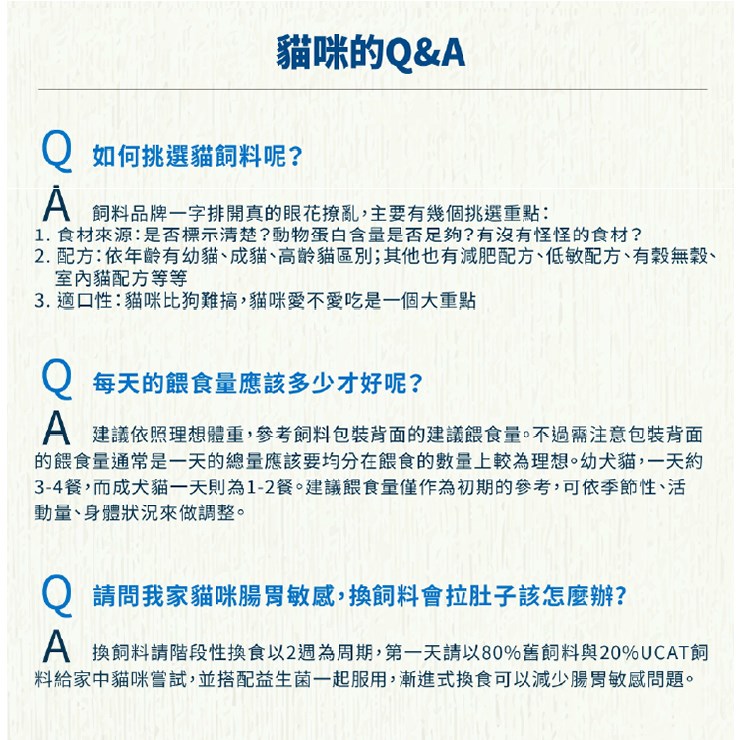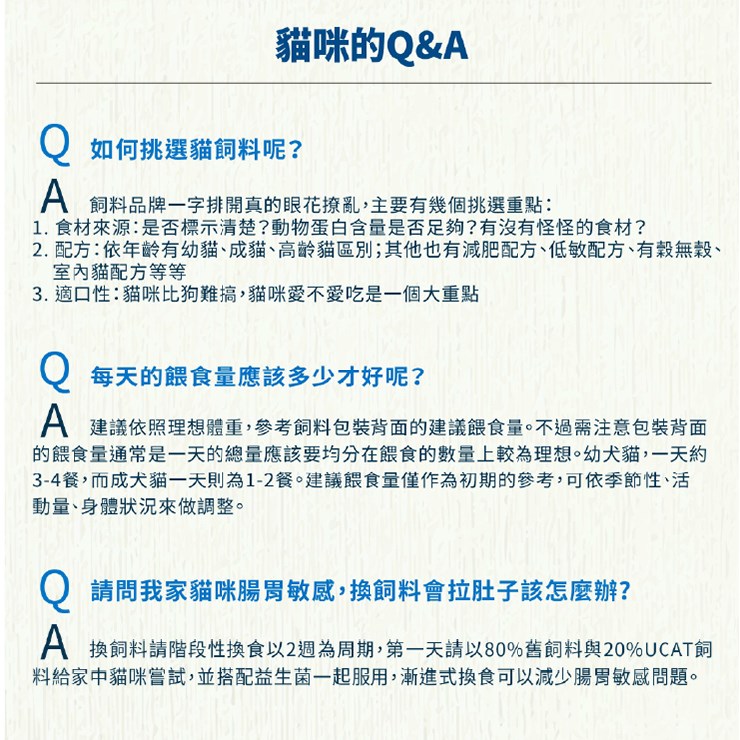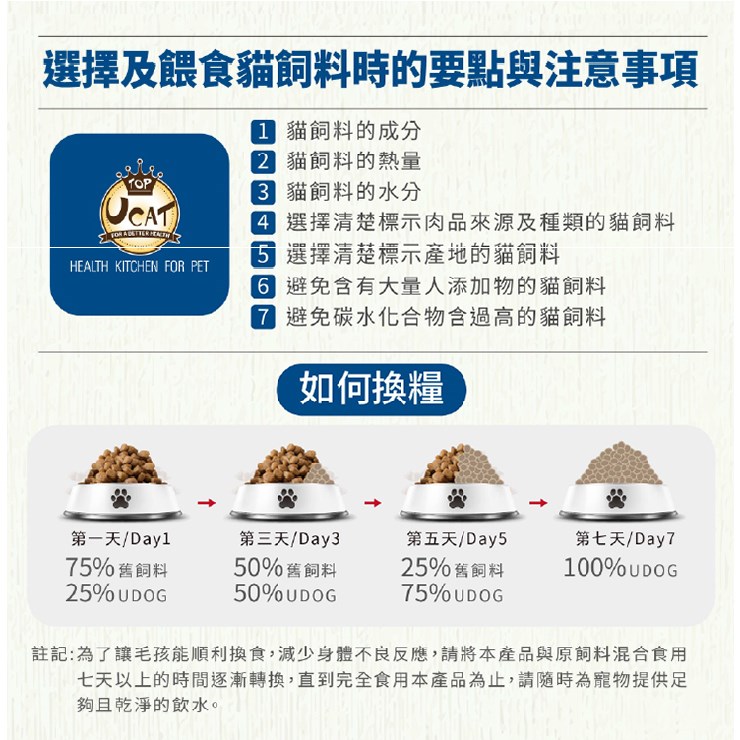 餵食方法: 初次使用UCAT挑嘴亮毛全貓糧時,請先與原飼料混合使用在逐漸轉換,以免寵物腸胃不適。