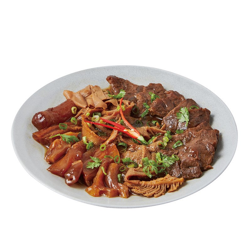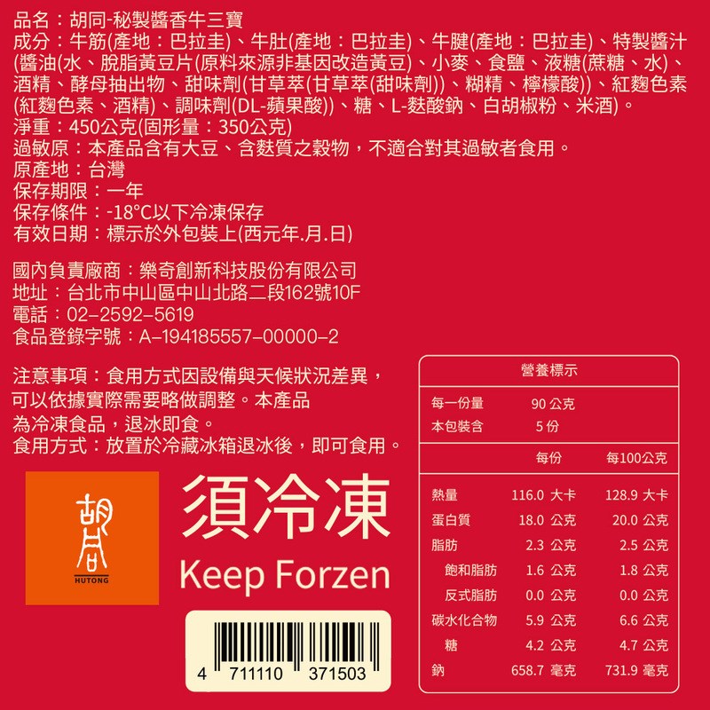 主要成分:牛筋(產地:巴拉圭)、牛肚(產地:巴拉圭)、牛腱(產地:巴拉圭)、特製醬汁(醬油(水、脫脂黃豆片 (原料來源非基因改造黃豆)、小麥、食鹽、液糖(蔗糖、水)、酒精、酵母抽出物、甜味劑(甘草萃(甘草萃(甜味劑)) 、糊精、檸檬酸))、紅麴色素(紅麴色素、酒精)、調味劑(DL-蘋果酸))、糖、L-麩酸鈉、白胡椒粉、米酒)。