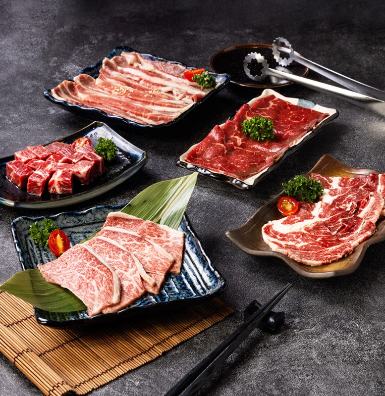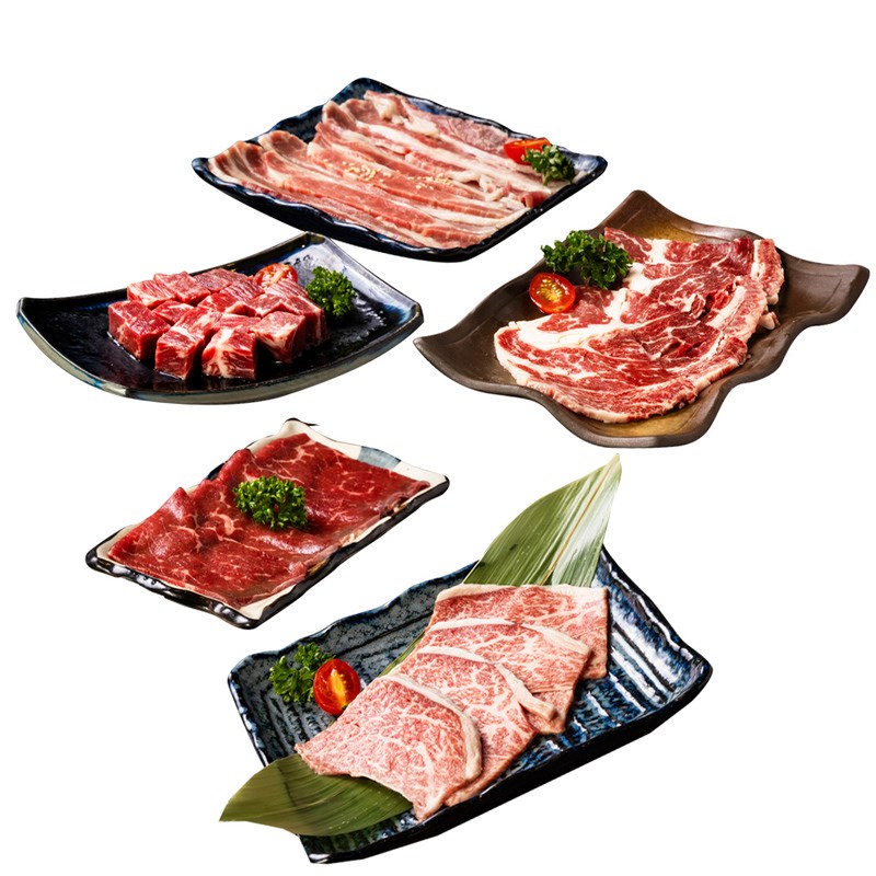 (內含:日本A5和牛霜降燒肉片100g/美國修清雪花牛燒肉片150g/澳洲和牛霜降燒肉片100g//澳洲和牛背肩燒肉片100g/澳洲和牛霜降骰子肉100g)