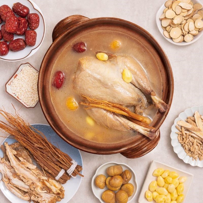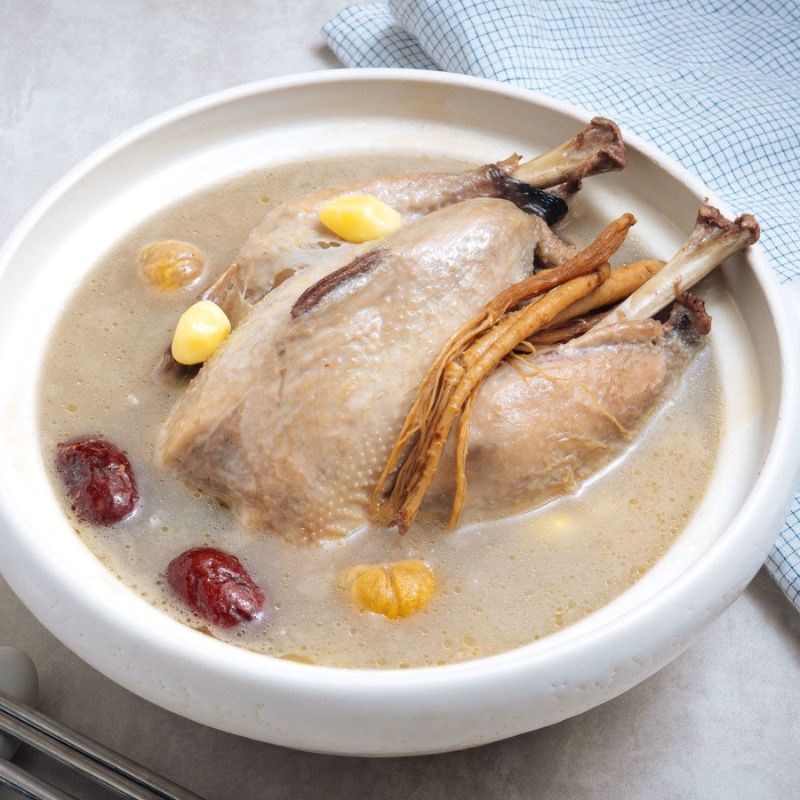 韓式人蔘古早雞湯 嚴選整隻放養古早雞,以慢火精燉數小時,熬製出香醇濃郁、溫潤不膩的湯頭。雞肉燉煮至軟嫩入味,充分吸收湯中精華,口感滑順。內餡加入栗子、白果與紅棗,含有多樣營養與膳食纖維,帶出自然清甜香氣。另搭配人蔘鬚、麥門冬、桑枝、黃耆與當歸等常見食補食材,風味層次豐富、湯底溫潤濃厚。無需繁複料理,即可在家輕鬆品嚐道地韓式人蔘雞湯,適合四季享用。