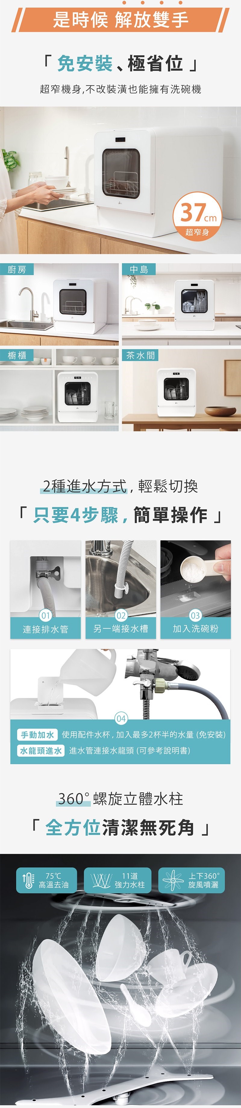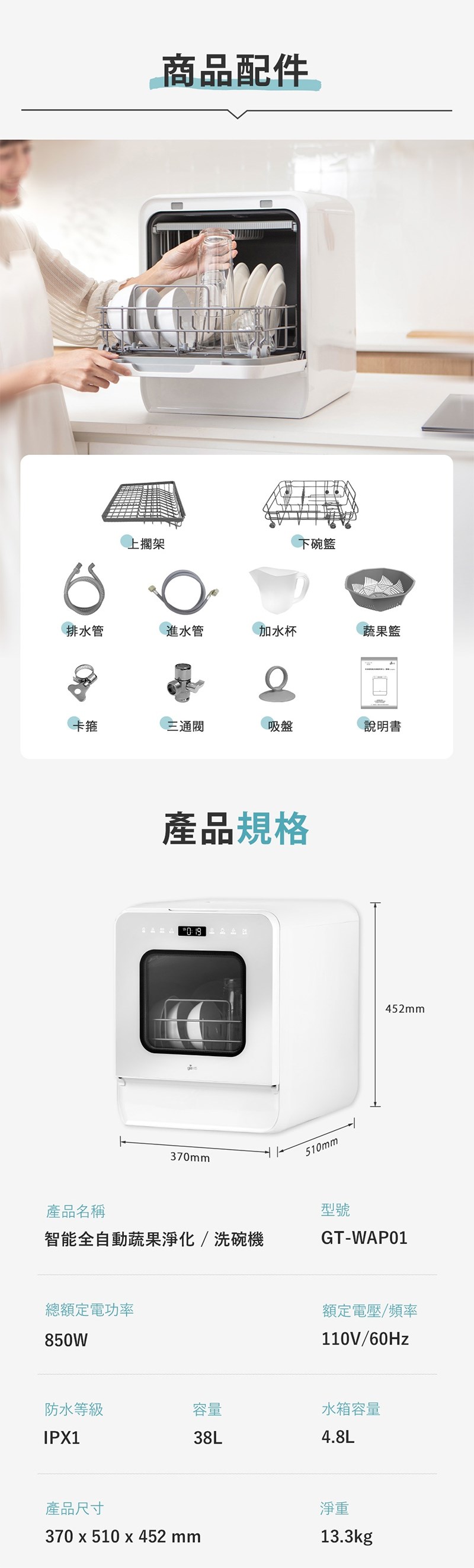 配件 : 卡箍、三通閥、排水管、進水管、吸盤、加水杯、蔬果籃、說明書