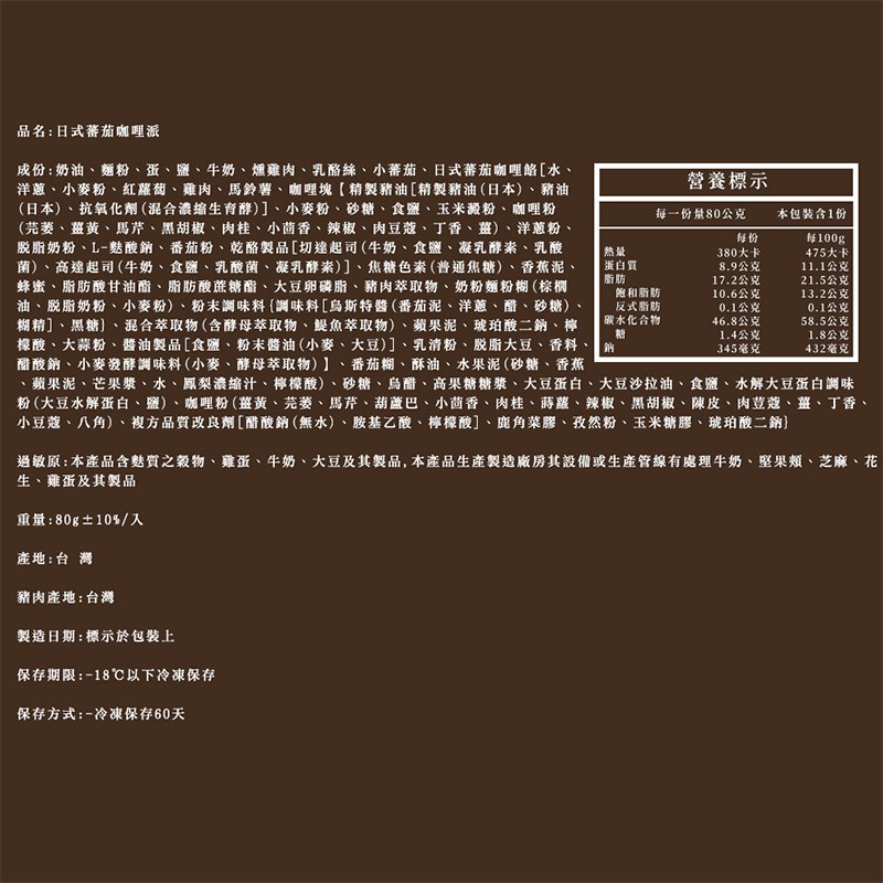 成份 | 奶油、麵粉、蛋、鹽、牛奶、燻雞肉、乳酪絲、小蕃茄、日式蕃茄咖哩餡[水、洋蔥、小麥粉、紅蘿蔔、雞肉、馬鈴薯、咖哩塊【精製豬油[精製豬油(日本)、豬油(日本)、抗氧化劑(混合濃縮生育酵)]、小麥粉、砂糖、食鹽、玉米澱粉、咖哩粉(芫萎、薑黃、馬芹、黑胡椒、肉桂、小茴香、辣椒、肉豆蔻、丁香、薑)、洋蔥粉、脫脂奶粉、L-麩酸鈉、番茄粉、乾酪製品[切達起司(牛奶、食鹽、凝乳酵素、乳酸菌)、高達起司(牛奶、食鹽、乳酸菌、凝乳酵素)]、焦糖色素(普通焦糖)、香蕉泥、蜂蜜、脂肪酸甘油酯、脂肪酸蔗糖酯、大豆卵磷脂、豬肉萃取物、奶粉麵粉糊(棕櫚油、脫脂奶粉、小麥粉)、粉末調味料{調味料[烏斯特醬(番茄泥、洋蔥、醋、砂糖)、糊精]、黑糖}、混合萃取物(含酵母萃取物、鯷魚萃取物)、蘋果泥、琥珀酸二鈉、檸檬酸、大蒜粉、醬油製品[食鹽、粉末醬油(小麥、大豆)]、乳清粉、脫脂大豆、香料、醋酸鈉、小麥發酵調味料(小麥、酵母萃取物)】、番茄糊、酥油、水果泥(砂糖、香蕉、蘋果泥、芒果漿、水、鳳梨濃縮汁、檸檬酸)、砂糖、烏醋、高果糖糖漿、大豆蛋白、大豆沙拉油、食鹽、水解大豆蛋白調味粉(大豆水解蛋白、鹽)、咖哩粉(薑黃、芫萎、馬芹、葫蘆巴、小茴香、肉桂、蒔蘿、辣椒、黑胡椒、陳皮、肉荳蔻、薑、丁香、小豆蔻、八角)、複方品質改良劑[醋酸鈉(無水)、胺基乙酸、檸檬酸]、鹿角菜膠、孜然粉、玉米糖膠、琥珀酸二鈉}