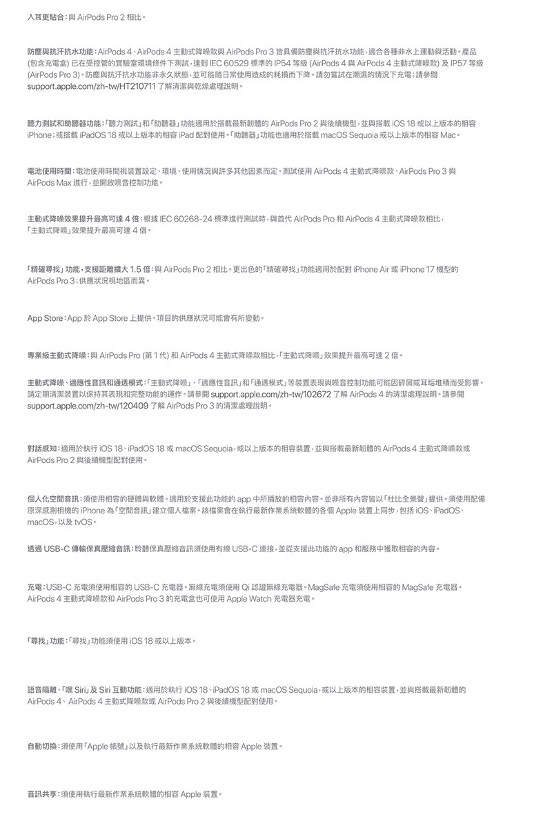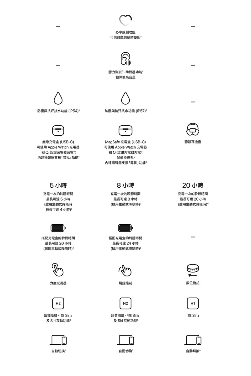全面改造的內部架構,帶來更優秀的聲學表現;外部幾何結構也重新設計,戴上耳更穩更貼合。電池續航力進一步提升,啟用「主動式降噪」時,充電一次的聆聽時間最長可達 8 小時。此外,AirPods Pro 3 更是首款具備 IP57 等級的 AirPods,防塵與抗汗抗水功能全面提升。