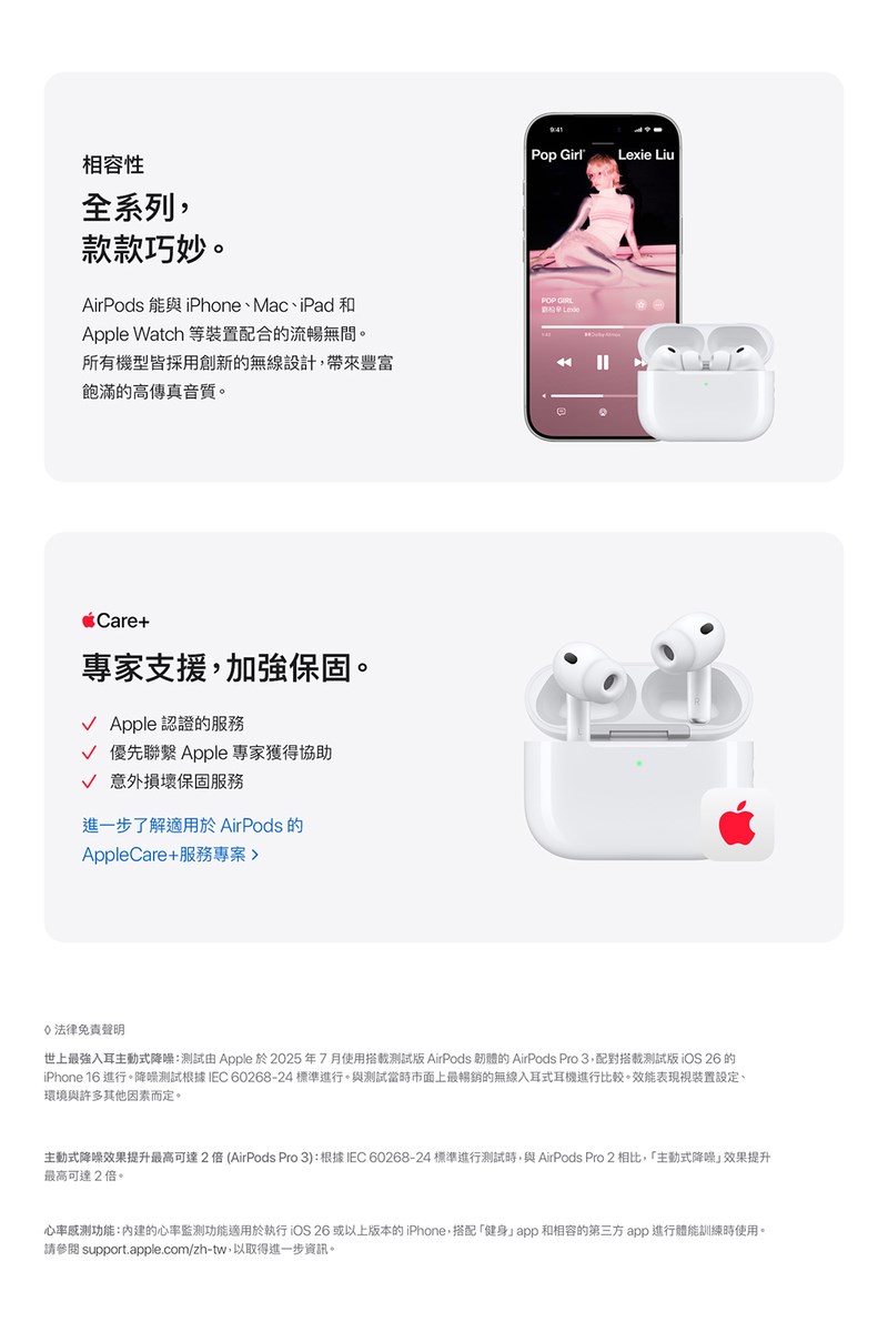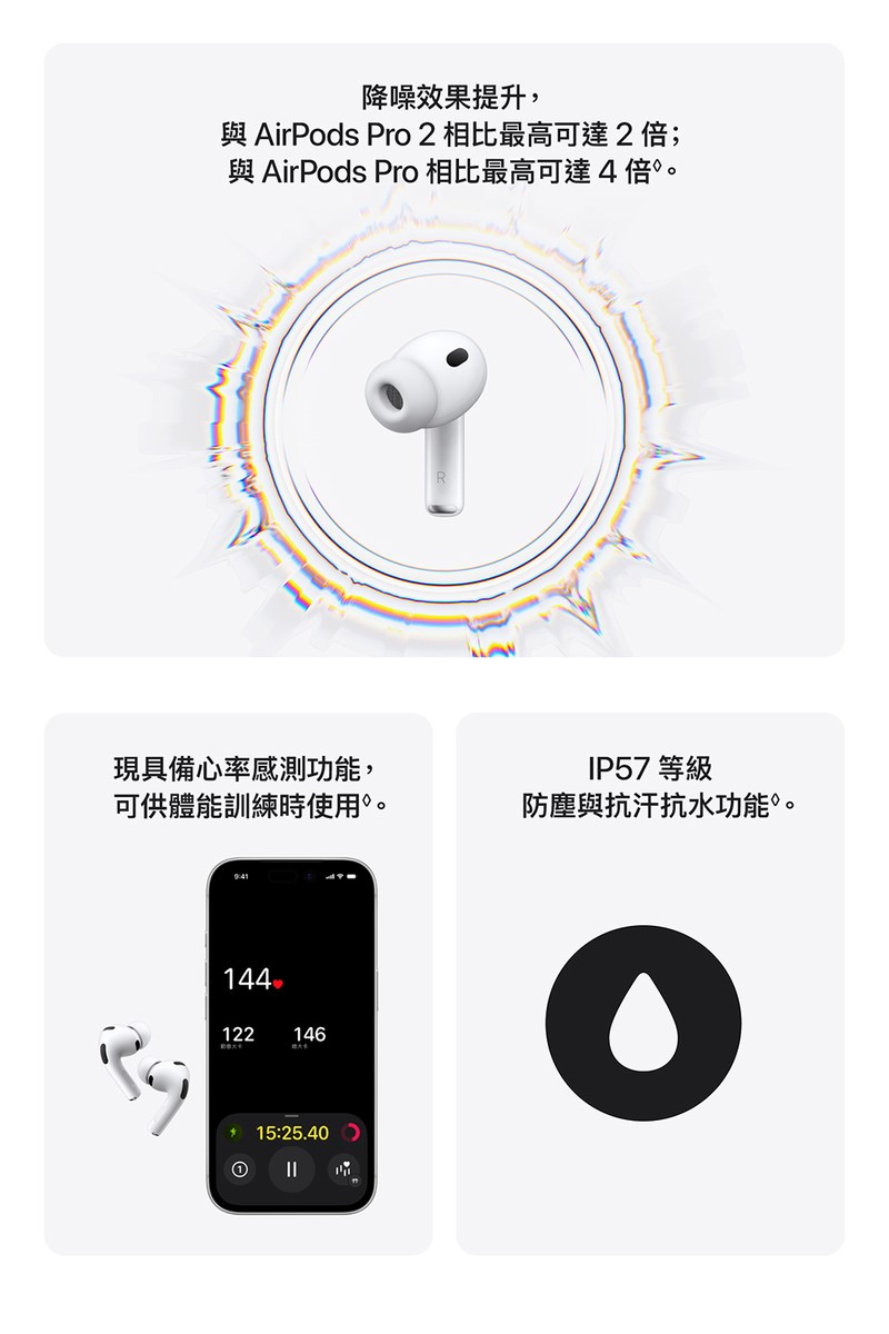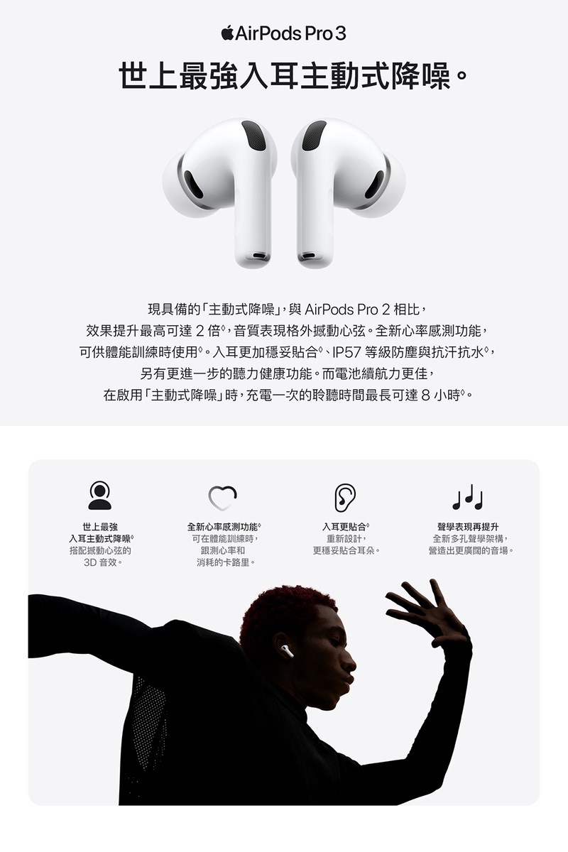 世上最強入耳「主動式降噪」,盡情體驗撼動心弦的音質。內建心率感測功能,可供你在體能訓練時,跟測心率和消耗的卡路里。AirPods Pro 3,更進一步帶來聽力健康功能。