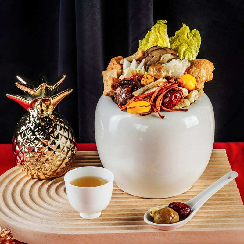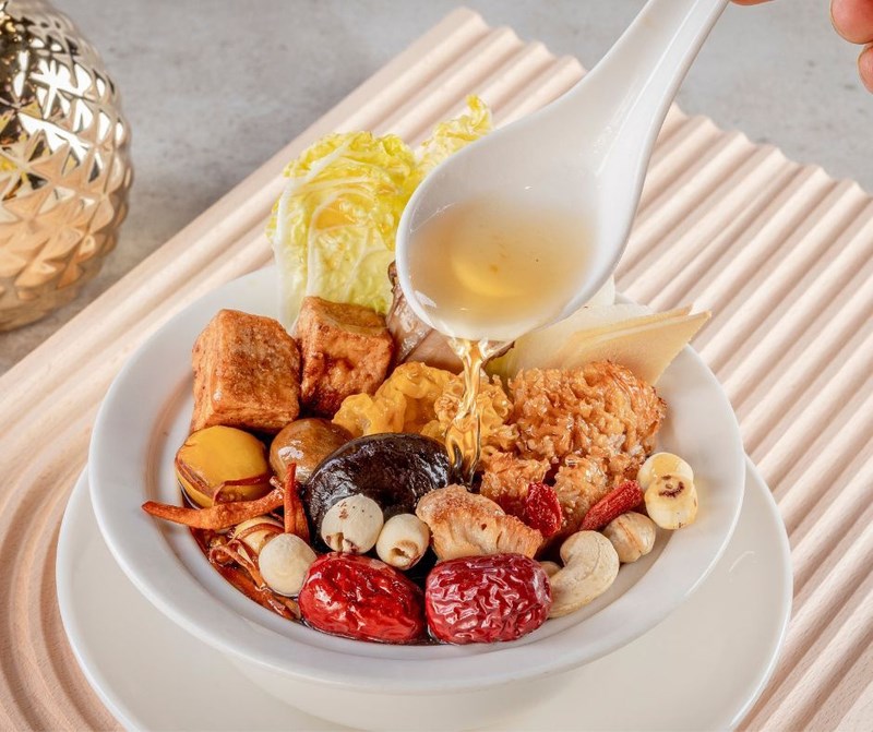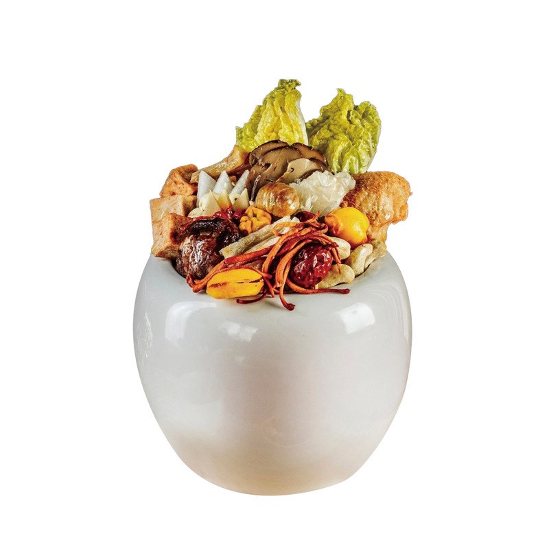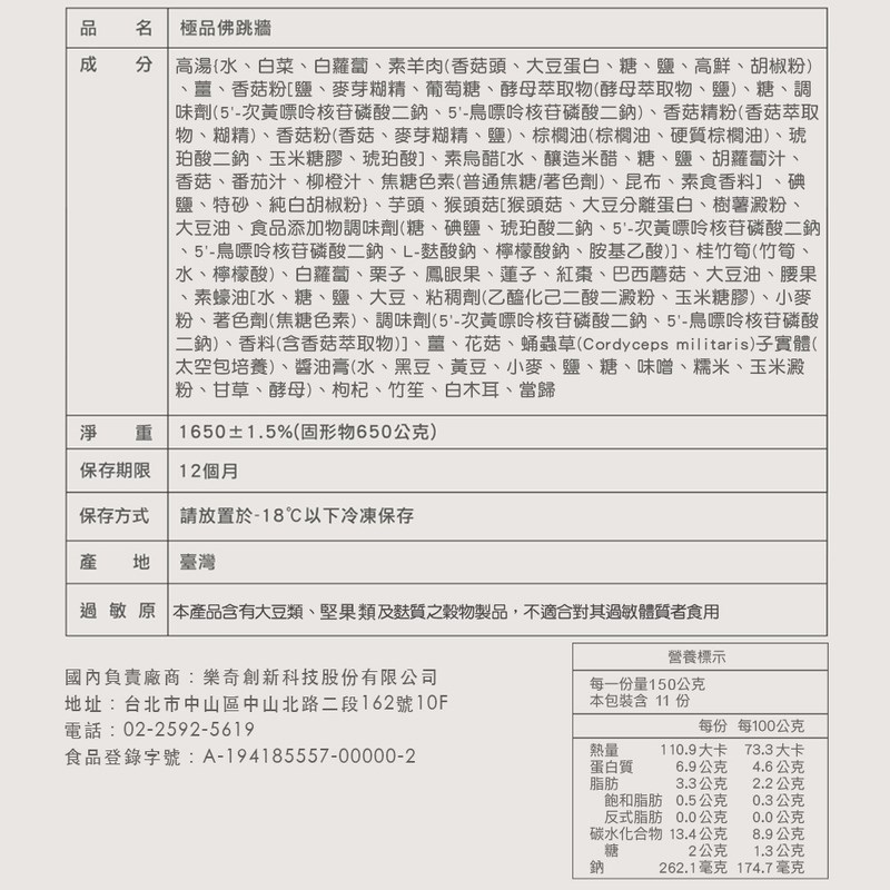 主要成分:高湯{水、白菜、白蘿蔔、素羊肉(香菇頭、大豆蛋白、糖、鹽、高鮮、胡椒粉)、薑、香菇粉[鹽、麥芽糊精、葡萄糖、酵母萃取物(酵母萃取物、鹽)、糖、調味劑(5'-次黃嘌呤核苷磷酸二鈉、5'-鳥嘌呤核苷磷酸二鈉)、香菇精粉(香菇萃取物、糊精)、香菇粉(香菇、麥芽糊精、鹽)、棕櫚油(棕櫚油、硬質棕櫚油)、琥珀酸二鈉、玉米糖膠、琥珀酸]、素烏醋[水、釀造米醋、糖、鹽、胡蘿蔔汁、香菇、番茄汁、柳橙汁、焦糖色素(普通焦糖/著色劑)、昆布、素食香料] 、碘鹽、特砂、純白胡椒粉}、芋頭、猴頭菇[猴頭菇、大豆分離蛋白、樹薯澱粉、大豆油、食品添加物調味劑(糖、碘鹽、琥珀酸二鈉、5'-次黃嘌呤核苷磷酸二鈉、5'-鳥嘌呤核苷磷酸二鈉、L-麩酸鈉、檸檬酸鈉、胺基乙酸)]、桂竹筍(竹筍、水、檸檬酸)、白蘿蔔、栗子、鳳眼果、蓮子、紅棗、巴西蘑菇、大豆油、腰果、素蠔油[水、糖、鹽、大豆、粘稠劑(乙醯化己二酸二澱粉、玉米糖膠)、小麥粉、著色劑(焦糖色素)、調味劑(5'-次黃嘌呤核苷磷酸二鈉、5'-鳥嘌呤核苷磷酸二鈉)、香料(含香菇萃取物)]、薑、花菇、蛹蟲草(Cordyceps militaris)子實體(太空包培養)、醬油膏(水、黑豆、黃豆、小麥、鹽、糖、味噌、糯米、玉米澱粉、甘草、酵母)、枸杞、竹笙、白木耳、當歸。