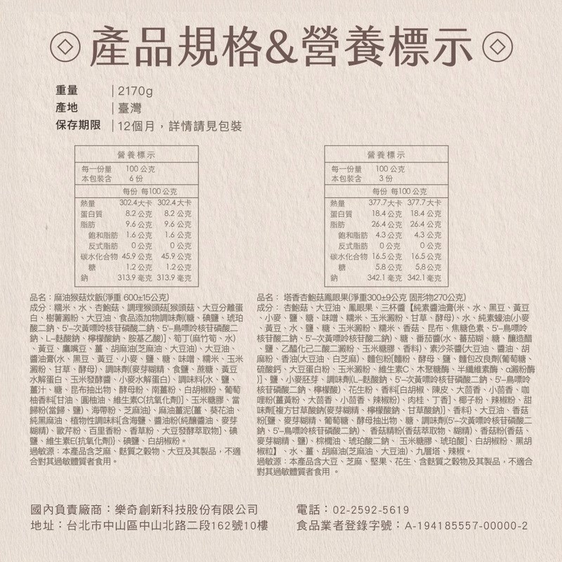 1)麻油猴菇炊飯:本產品含大豆、芝麻、含麩質之穀物及其製品,不適合對其過敏體質者食用。