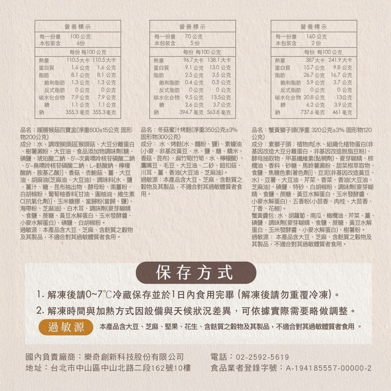 2)暖膳猴菇四寶盅:本產品含大豆、芝麻、含麩質之穀物及其製品,不適合對其過敏體質者食用。