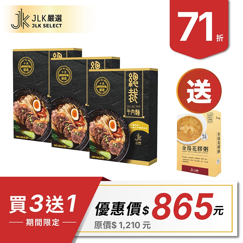 商品組合:總裁牛肉麵-常溫單入X3 送 金湯花膠粥X1