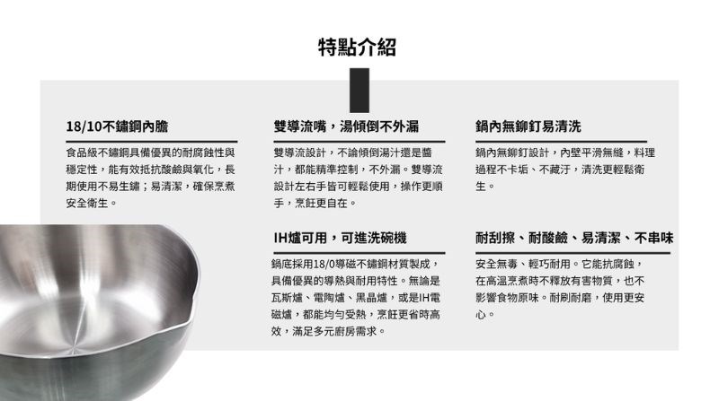 • IH爐可用 ✦ 18/0導磁不鏽鋼鍋底,均勻受熱,省時高效