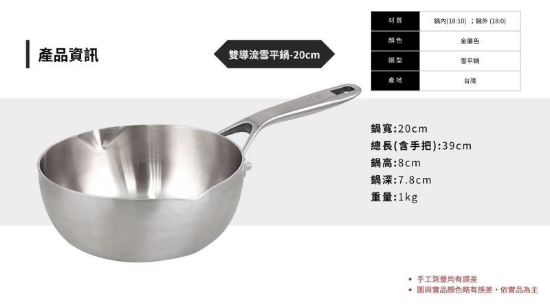 • 規格  :     直徑20CM  ;鍋高8CM  ; 手柄19CM  /  重量  :  1KG