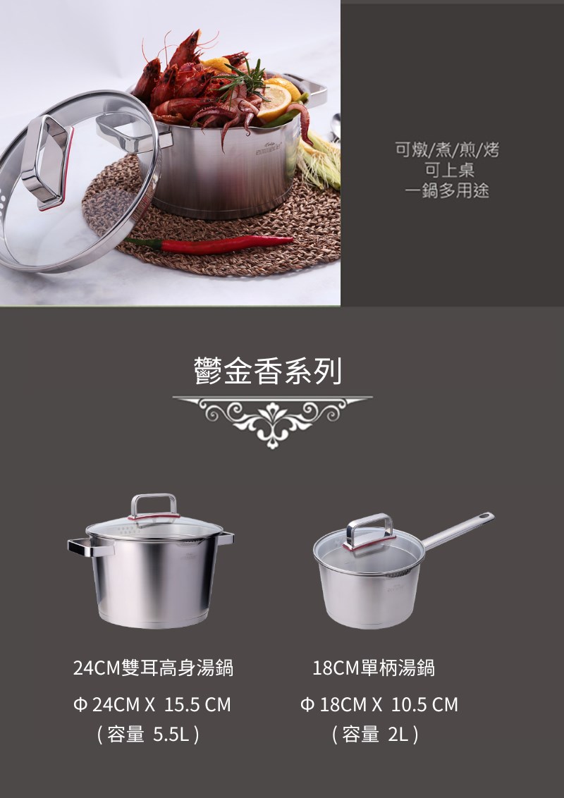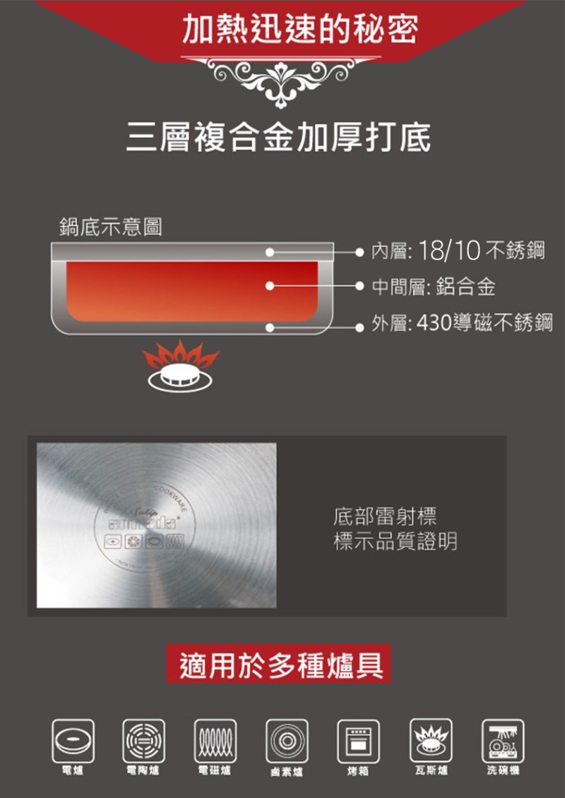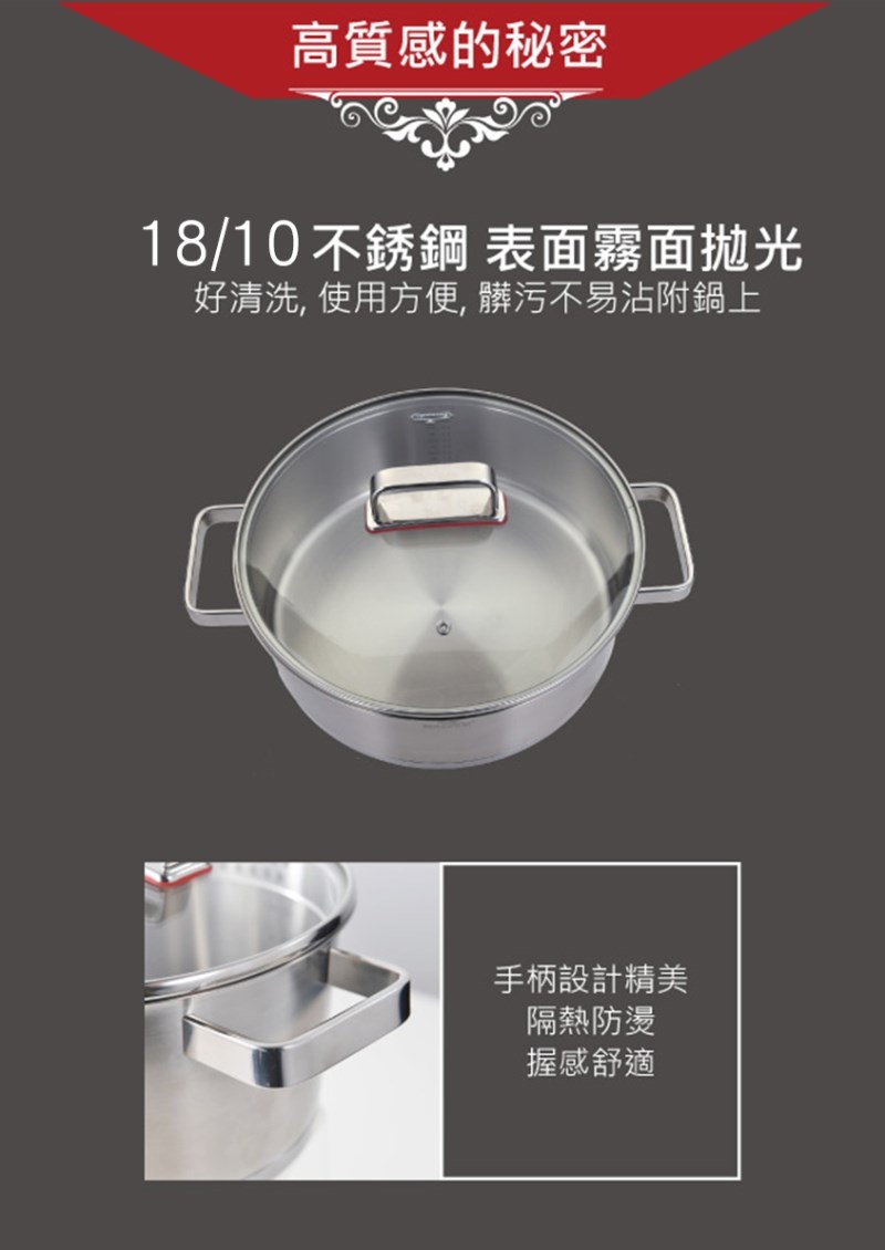 以優雅錐形鍋身為設計靈感,搭配18/10高級不鏽鋼三層複合加厚底,帶來快速均勻的導熱表現。