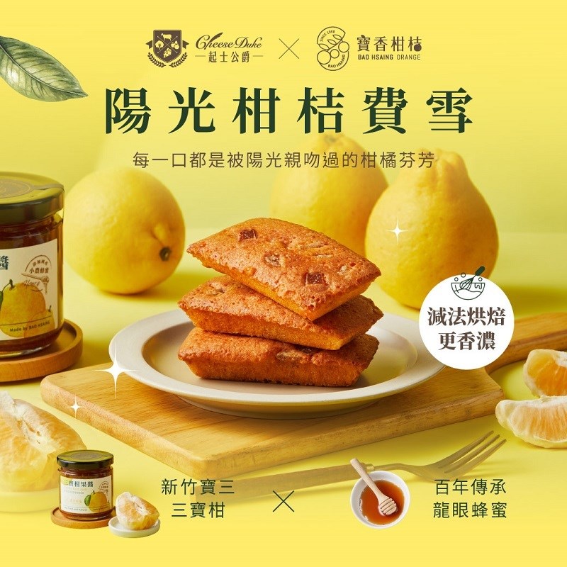 成分:奶油、新鮮蛋液、蔗糖、低筋麵粉、三寶柑果醬(三寶柑、蔗糖、蜂蜜、檸檬酸、鹽、維生素C)、桔皮丁、龍眼蜂蜜、無鋁泡打粉 (磷酸二氫鈣、碳酸氫鈉、玉米粉)