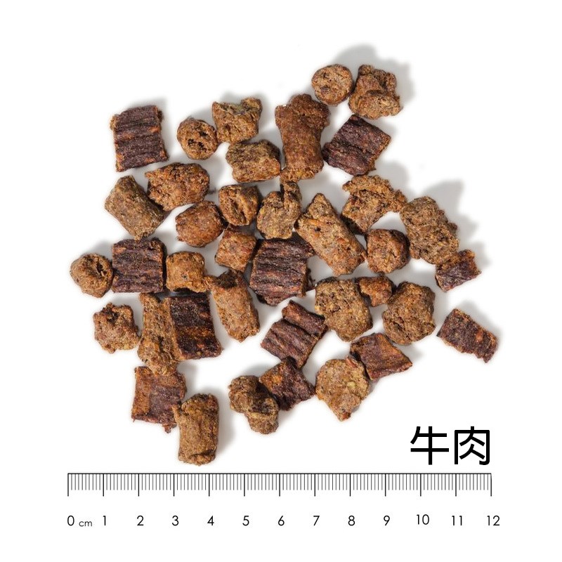 牛肉、蠶豆、豌豆、羊肉粉、牛肝、羊肉、羊肝、亞麻籽、天然香料、牛肺、血粉、魚油、奇異果、紅蘿蔔、地瓜、藍莓、南瓜、氯化膽鹼、食鹽、絲唇胎貝、植物性甘油、海帶、麥盧卡蜂蜜、天然抗氧化劑、牛璜酸、碳酸鈣、碳酸鉀、氯化鉀、鐵、硝酸二鉀、維生素E、鋅、維生素B3、銅、維生素B1、A、硒、維生素B2、B5、錳、維生素D3、B6、B10、B12、碘、葉酸、維生素K。