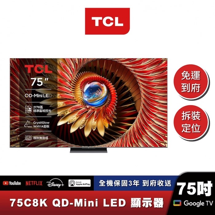 【TCL】75C8K頂級QD-Mini LED Google TV 量子智能連網液晶顯示器